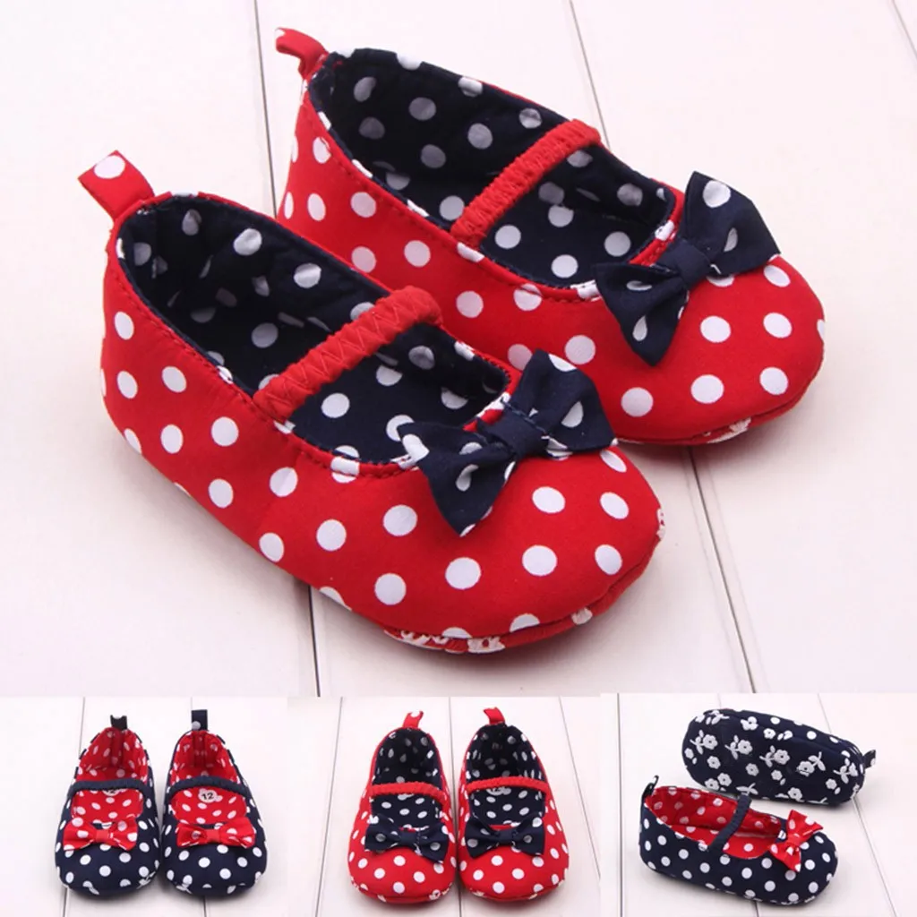 Детская обувь для новорожденных мальчиков и девочек, обувь для первых шагов в горошек с бантом, нескользящая обувь для первых шагов на мягкой подошве, милая обувь для маленьких принцесс