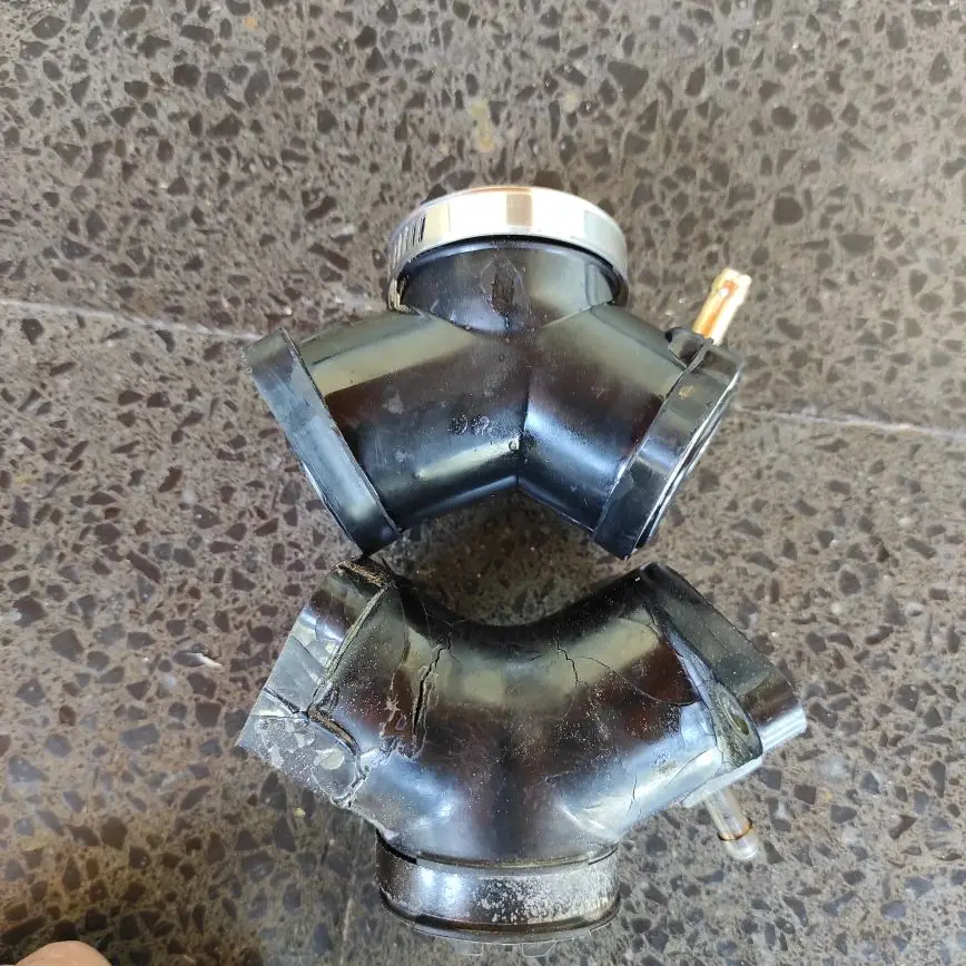 Attention, le carburateur est vendu avec des gicleurs trop gros (ralenti 40 et principal 158 au lieu de 17,5 et 110 en origine, il faut donc en acheter séparément et le filetage du gicleur principal n'est pas tout à fait compatible avec les gicleurs mikuni d'origine, légère différence de filetage). La pipe d'admission est quant à elle trop courte et de s'adapte pas correctement sur le moteur de la virago. Je suis obligé d'en trouver une autre (Sur les photos pipe origine en bas, pipe fournie avec le carbu en haut)