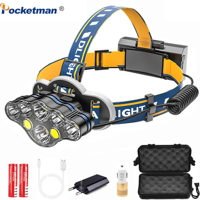 Сверхъяркий и долгий срок службы: налобный фонарь состоит из 7 светодиодный ных ламп и красного заднего фонаря безопасности с максимальной яркостью 12000 люмен и дальностью освещения 500 метров, помогает четко видеть окружающую среду и избегать опасности. Он поставляется с USB-линией и 2 аккумуляторными батареями для обеспечения более яркого и долговечного срока службы.