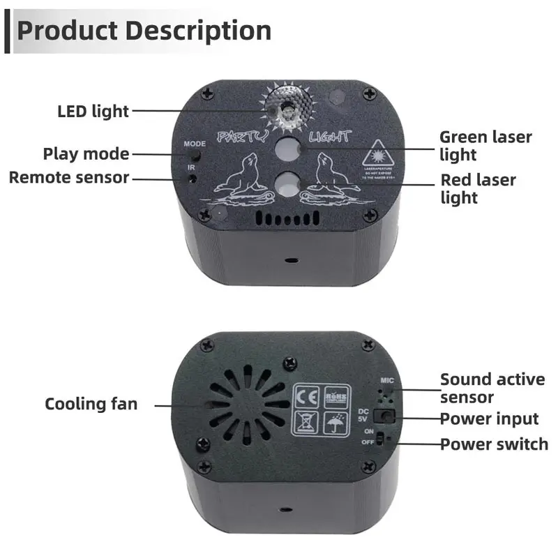 ИК-пульт, по сравнению с другими портативными сценическими лампами, наши беспроводные лазерные огни разработаны с голосовым активированным режимом или интеллектуальным режимом, вы можете легко переключаться между двумя режимами, нажав кнопку. Питание пульта дистанционного управления от батареи 2 * CR2025 (батарея не входит в посылка)