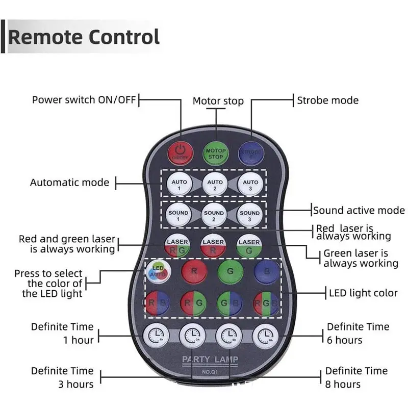 3 автоматического режима и 3 звуковая активация режима, режим стробоскопа, временные параметры (1/3/6/8 часа времени настройки, чтобы соответствовать вашим ожиданиям), режим освещения (остановки двигателя) новые музыкальные дискотечные огни легко создают яркую атмосферу, поэтому вы можете создавать страстные вечеринки в любое время и в любом месте.
