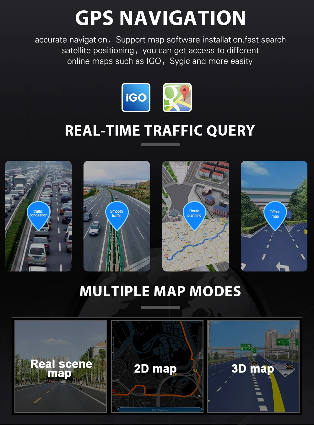 2.-Встроенная навигация:Для более точного определения местоположения, поиска правильного маршрута, мы используем двойную спутниковую систему позиционирования GPS + ГЛОНАСС. Вы можете получить доступ к различным онлайн-картам, таким как Google map ,IGO, sygic Waze и другая программа GPS.