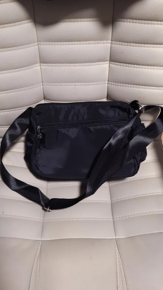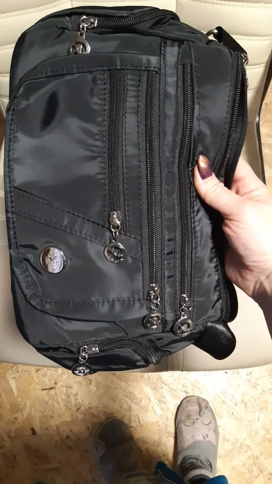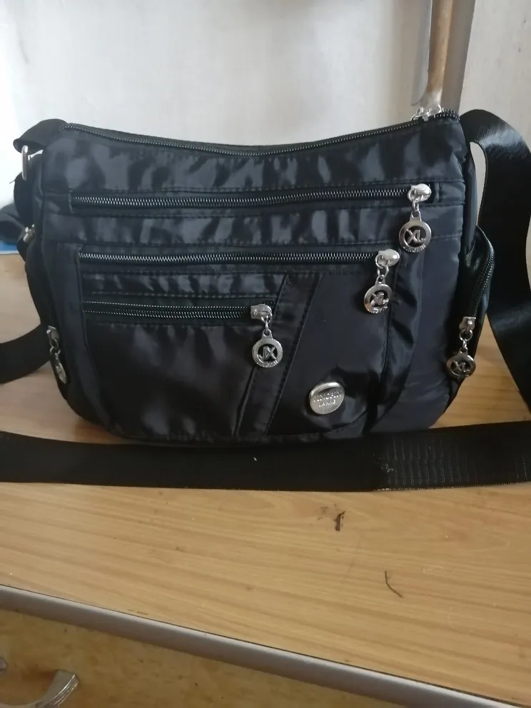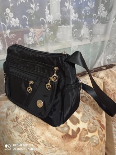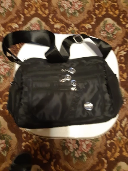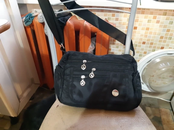 Сумка очень легкая, хорошо смотрится. Цвет боала черный. Материал похож на хорошую болонью, блестящий, водоотталкивающий, хорошо моющийся. Много кармашков и внутри и снаружи. Внутри 2 кармана на замке. Сшита хорошо, нитки нигде не торчат, замки легко открываются. Удобный и надежный ремень, чтобы носить через плечо. В Томск дошла за 3 недели. Спасибо продавцу.