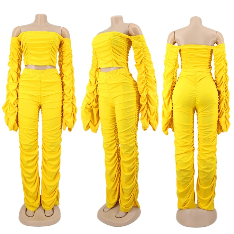 Женский клубный комплект из двух предметов, соблазнительные комплекты на день рождения, праздничная одежда, короткий топ с рюшами и расклешенные брюки, комплект из двух предметов с открытыми плечами