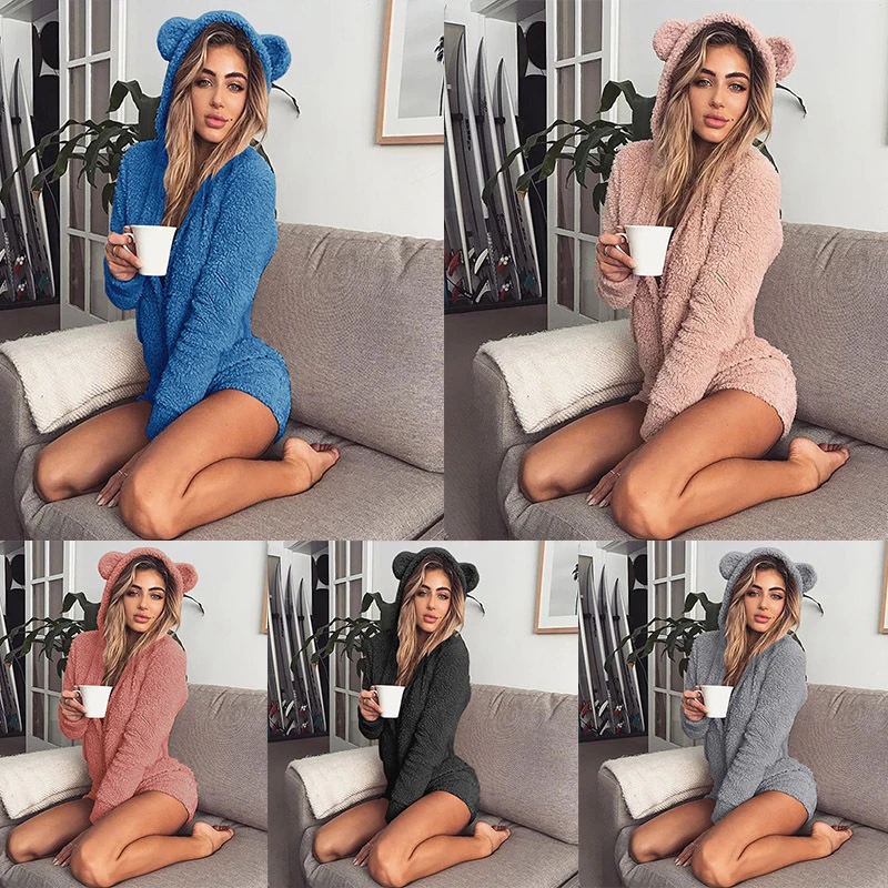 Женский Плюшевый комбинезон с капюшоном и длинными рукавами, новый однотонный теплый комбинезон с милыми медвежьими ушками из искусственного меха, осенне-зимние повседневные шорты, костюм для игр