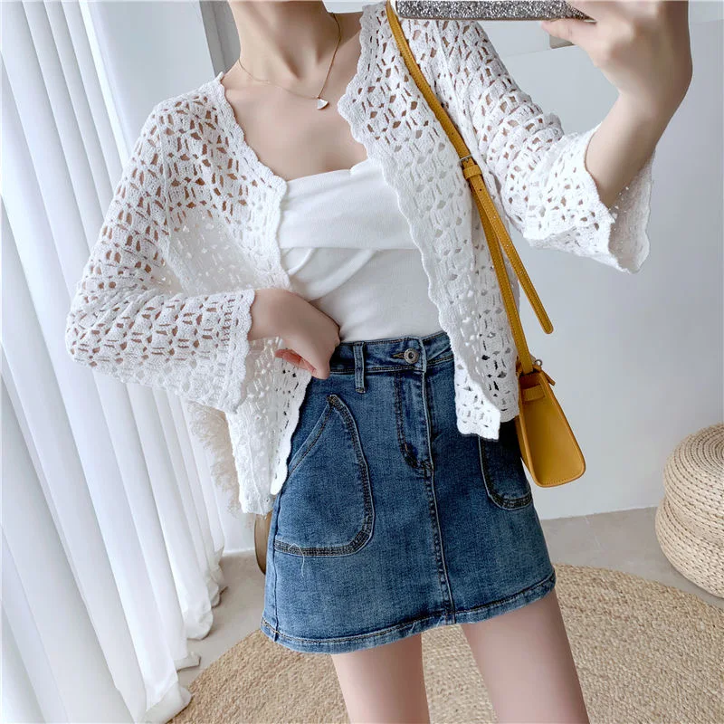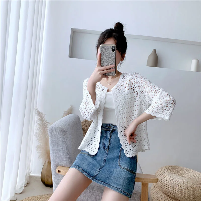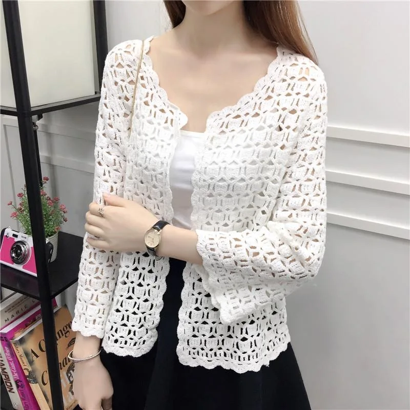 Женская кружевная блузка, белый и абрикосовый кружевной топ, вязаный кардиган с вырезами, весна-лето
