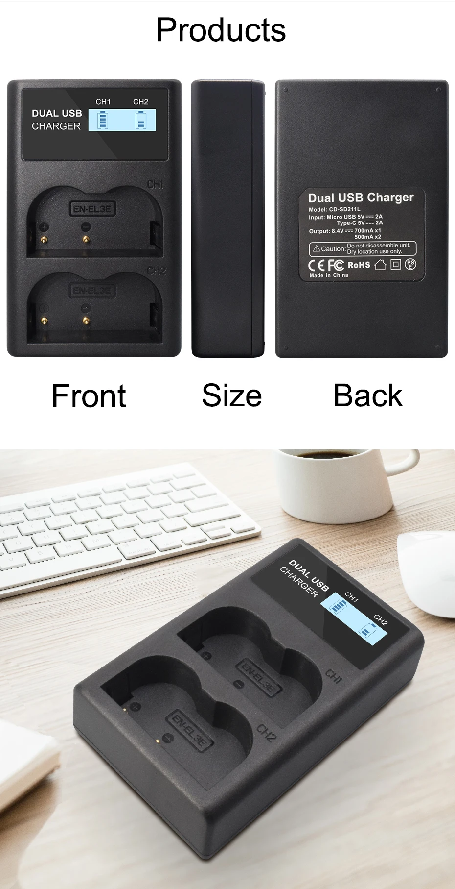 100% Оригинальный аккумулятор EN-EL3E ENEL3E для цифровой камеры и зарядное устройство с двумя USB-портами и ЖК-дисплеем для Nikon D300S D300 D100 D200 D700 D70S D80 D90