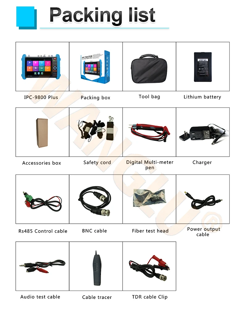 IP + тест аналогового изображения + выход цветного бара + сетевой кабель TDR тест качества + Высокоточный мультиметр модуль + оптический модуль измерителя мощности + Видимый красный светильник Модуль источника + TDR контрольный модуль останова и короткого замыкания +Кабель tracer