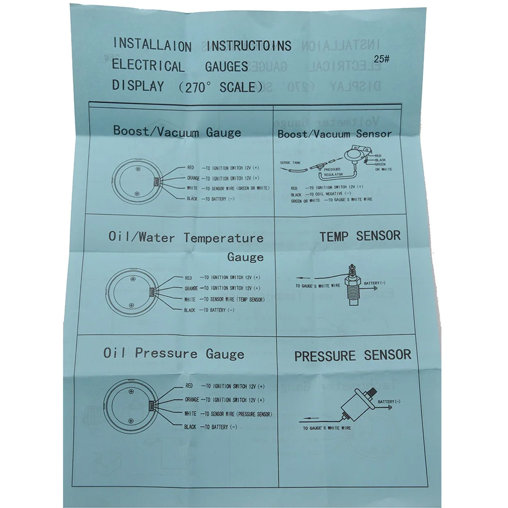 Тахометр: 0 ~ 10x1000 об/мин Усиление давления: -1 ~ 2x кПа Вакуумный манометр:-1 ~ 0 бар Датчик температуры воды: 50 ~ 150 ℃ Датчик температуры масла: 50 ~ 150 ℃ Манометр масла: 0 ~ 10X кПа Вольтметр: 8 ~ 18 в Измеритель Коэффициента воздушного топлива: 20:1 ~ 10:1 Измеритель температуры выхлопных газов: 3 ~ 12 × 100 ℃