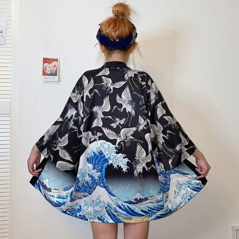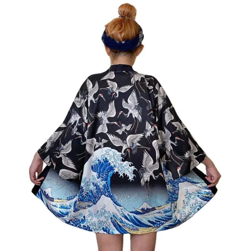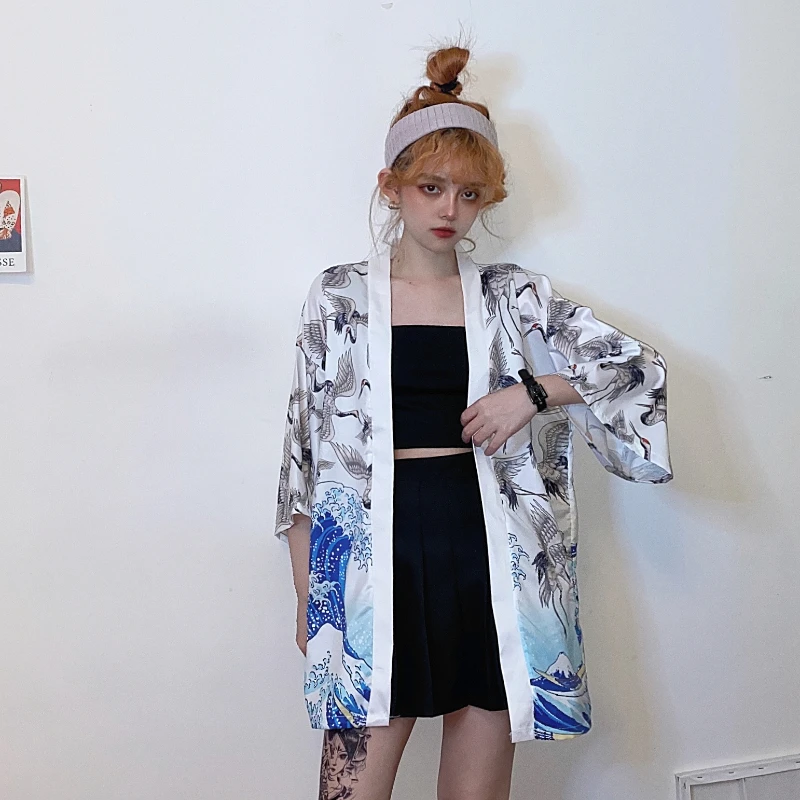 Рубашка ханьфу в китайском стиле, кимоно с японским журавлем, кардиган, Женская Солнцезащитная одежда, свободный женский кардиган бойфренда в стиле арадзюку с Оби