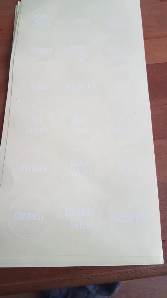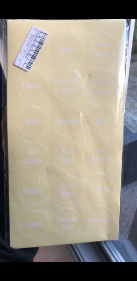 наклейки отличного качества, на металлических крышечках, практически не видно что это наклейка. Смотрится достойно, приехали быстро (за 2 недели), единственно НО, это то что много приправ которые повторяются в том или ином названии. В целом довольна и стоит своих денег