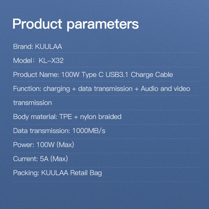 USB-кабель KUULAA 100 Вт с портом Type-C для быстрой зарядки, 5 А