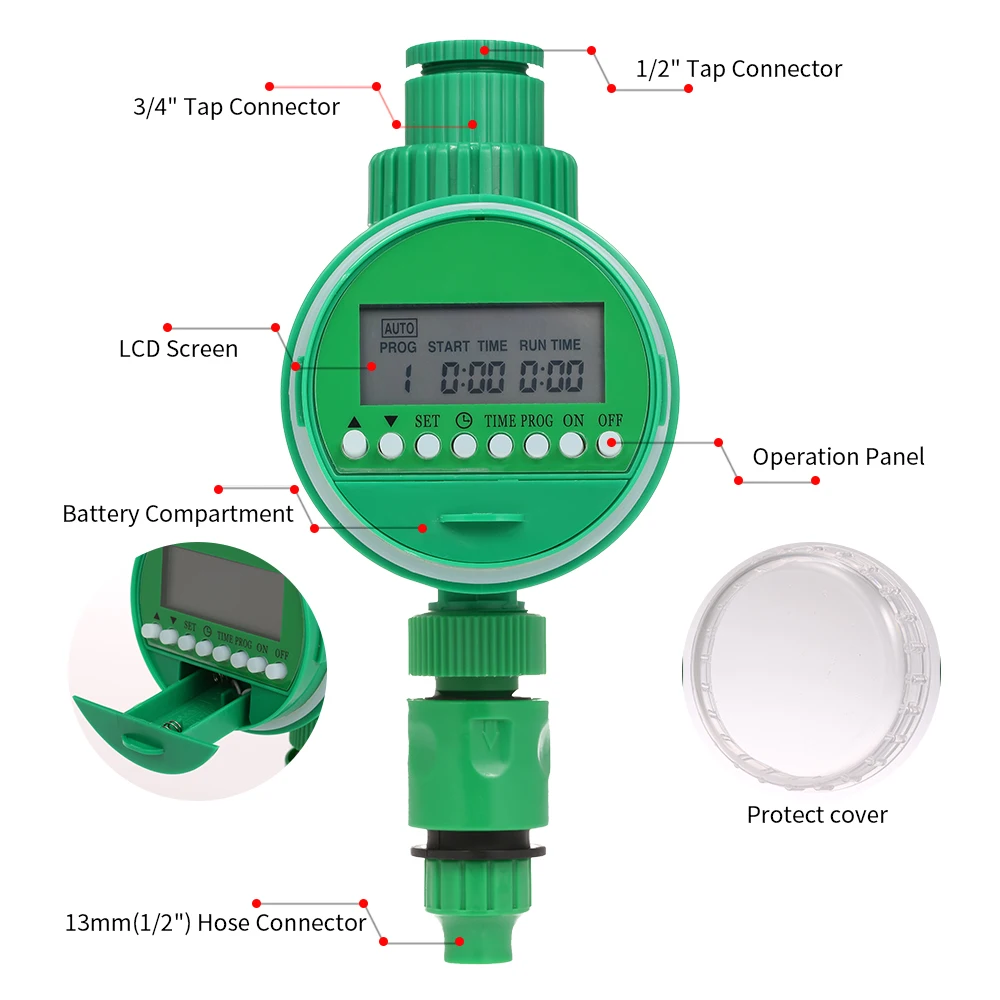 Описание: Этот таймер отличается простотой, простотой установки и программирования. Нет необходимости в инструментах. Просто установите время начала, продолжительность и частоту полива. Большой, легко читаемый ЖК-экран упрощает программирование. Больше никаких мертвых растений или морозных газонов, потому что вы забыли их поливать. Особенности: Самый долгий период можно установить один раз в 30 дней, время полива может быть точным до 1 минуты, до 9 часов 59 минут. Большой ЖК-экран с индикатором низкого заряда батареи показывает состояние орошения и стандартное время/день. Ручной переключатель для сохранения программирования и гибкого ручного полива. Соответствующий смеситель: 1/2 "или 3/4" снаружи резьбы, удовлетворяет различные потребности. Питание от 2 щелочных батарей 1,5 В, не требуется проводка. Характеристики: Цвет: зеленый Питание: 2 щелочные батареи 1,5 В (не входят в комплект) Смеситель матча: 1/2 "или 3/4" снаружи резьбы. Рабочее давление воды: 0.1MPA-0.6MPA Рабочая температура: 0-60 ℃ Расход: 600-800 л/ч Материал: ABS Посылка: 12,5*12*10 см/4,9*4,7*3,9 дюйма Вес посылка: 303 г/10,7 унции Примечание: 1. Таймер контролирует только поток воды, он не повысит напор воды. 2. Пожалуйста, Очистите фильтр периодно. 3. Меняйте батарею каждые 6 месяцев, чтобы убедиться, что она работает хорошо. Комплектация: 1*1/2 "соединитель водопроводного крана 1*3/4 "соединитель водопроводного крана 1 * панель управления 1 * быстроразъемный разъем