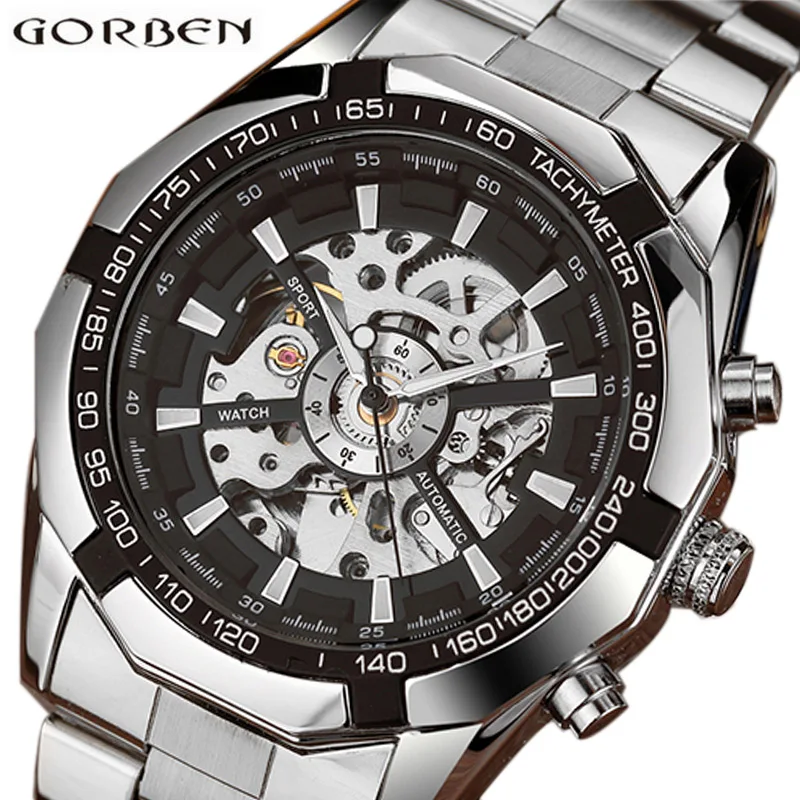 Мужские механические часы-скелетоны с автоматическим браслетом из нержавеющей стали