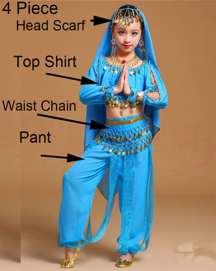 Детские костюмы для танца живота для девочек, костюмы для восточных и индийских танцев, комплект из 4 предметов (топ, рубашка, шарф, цепочка на талию и брюки)