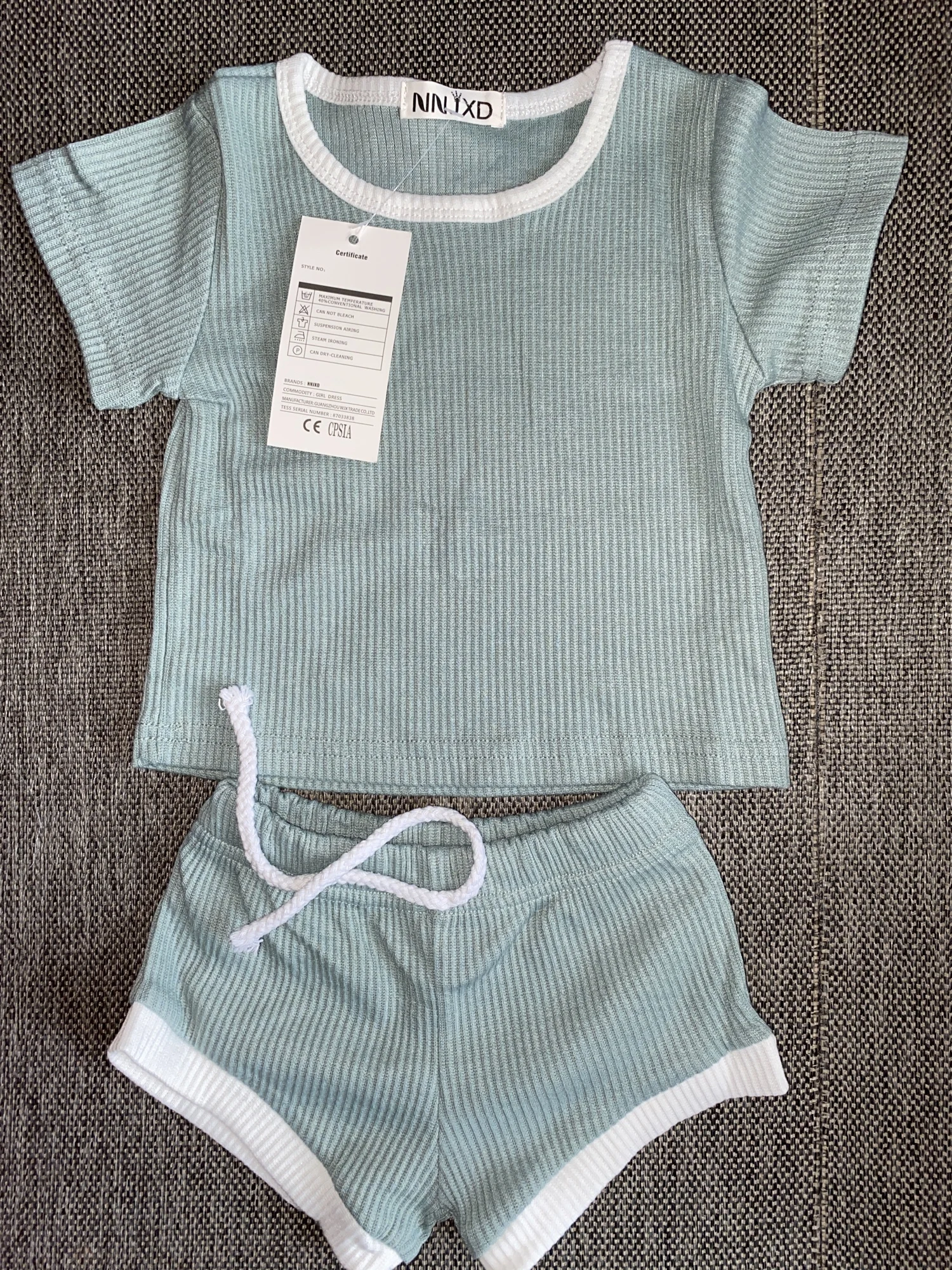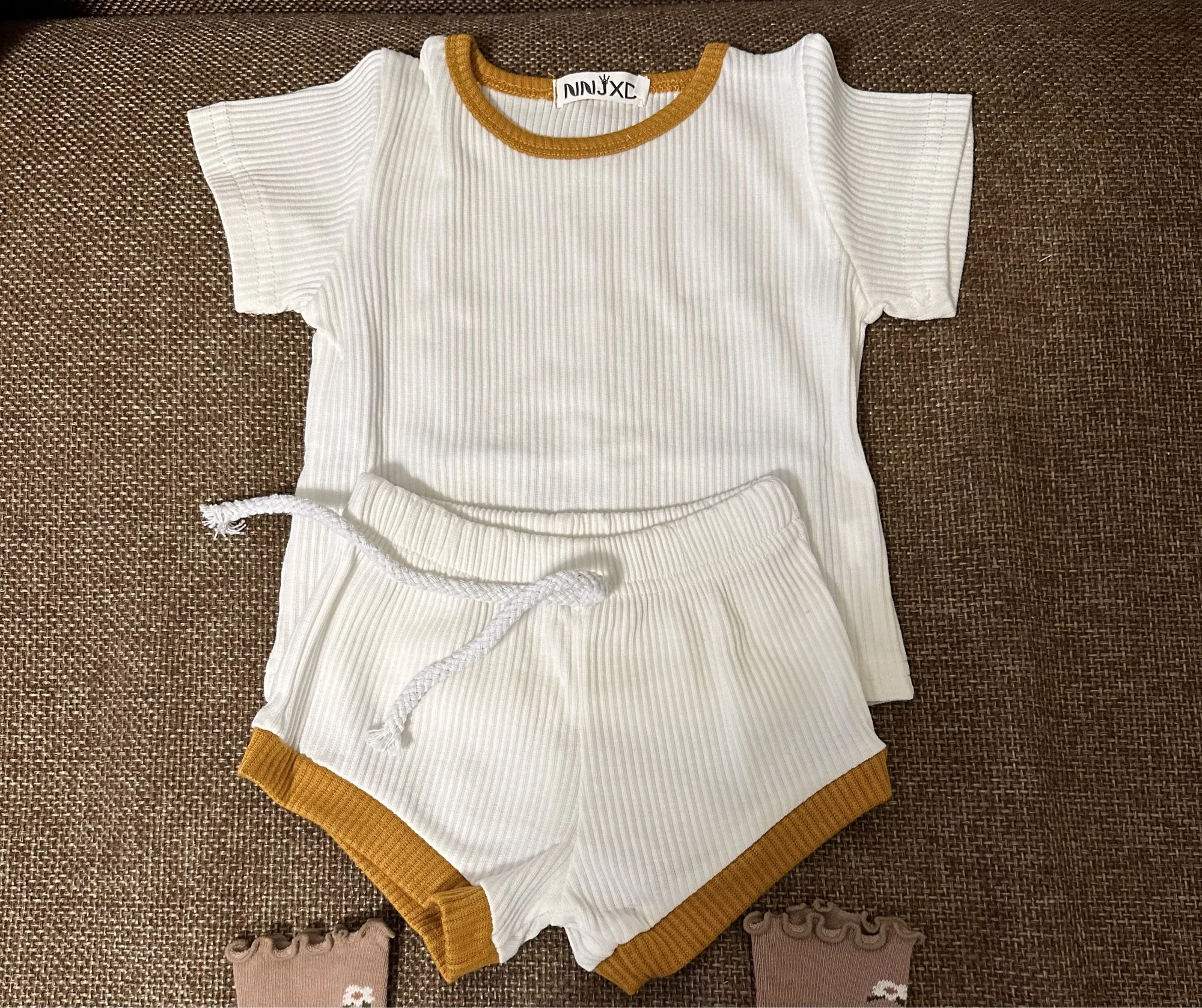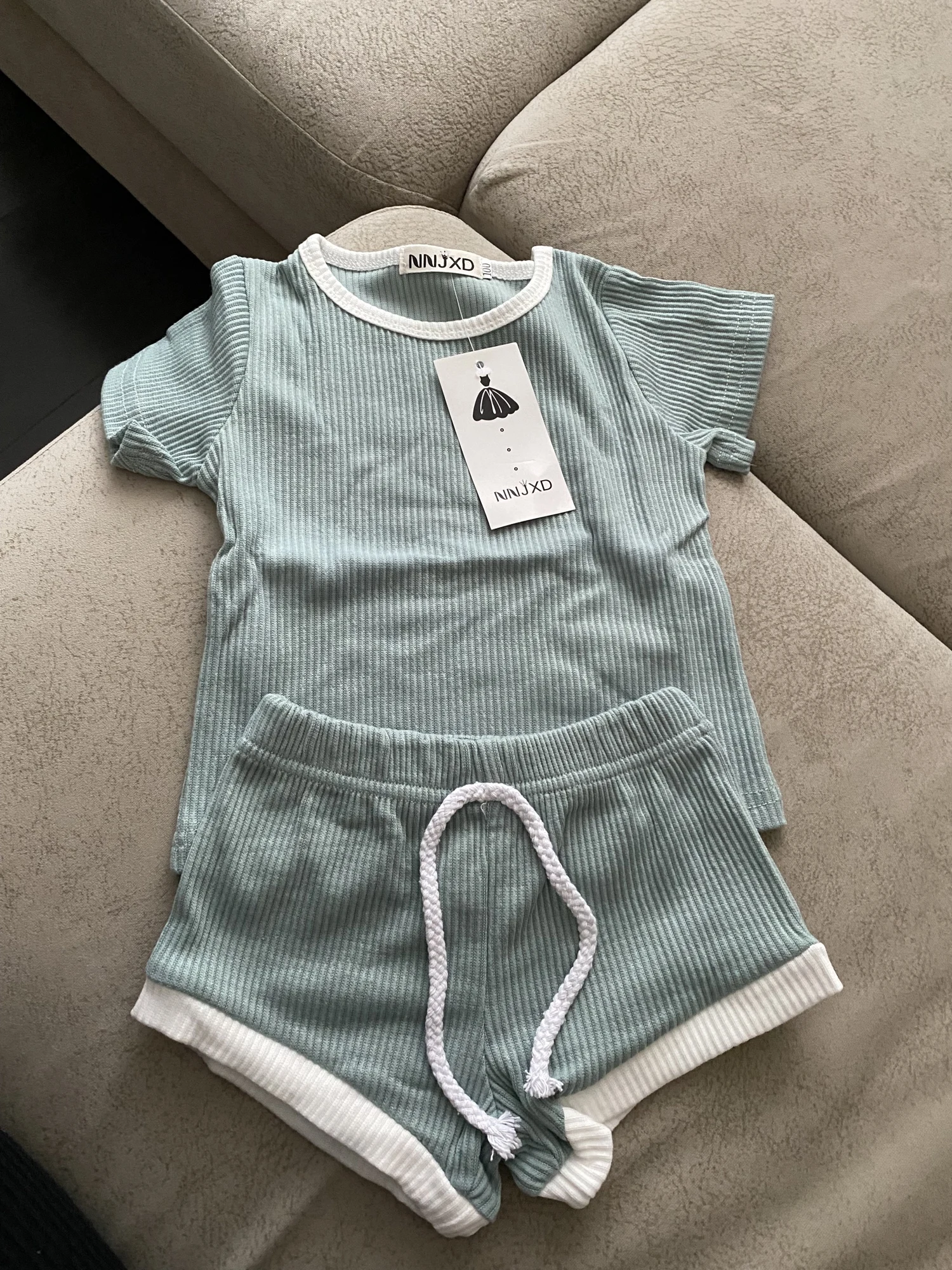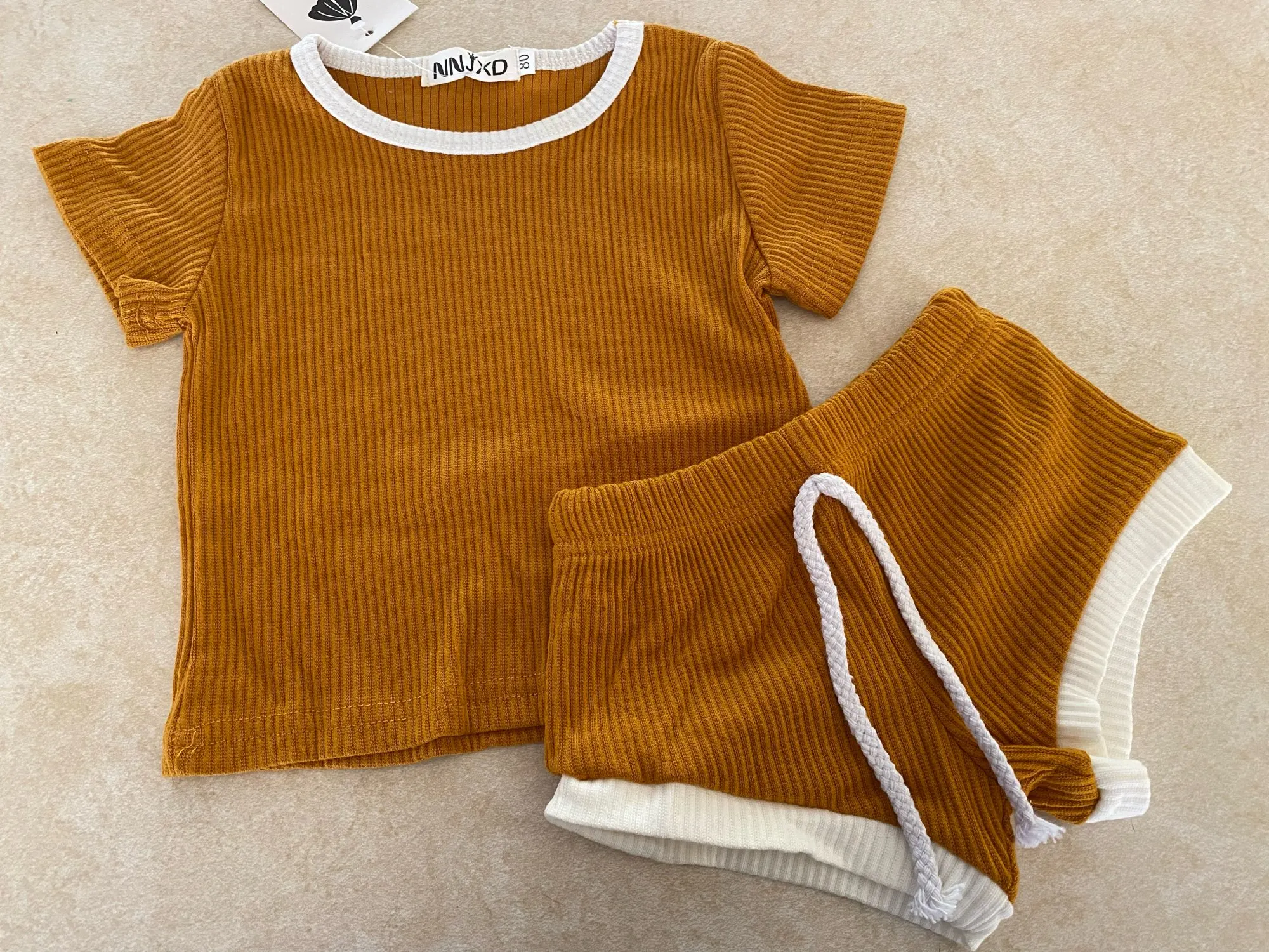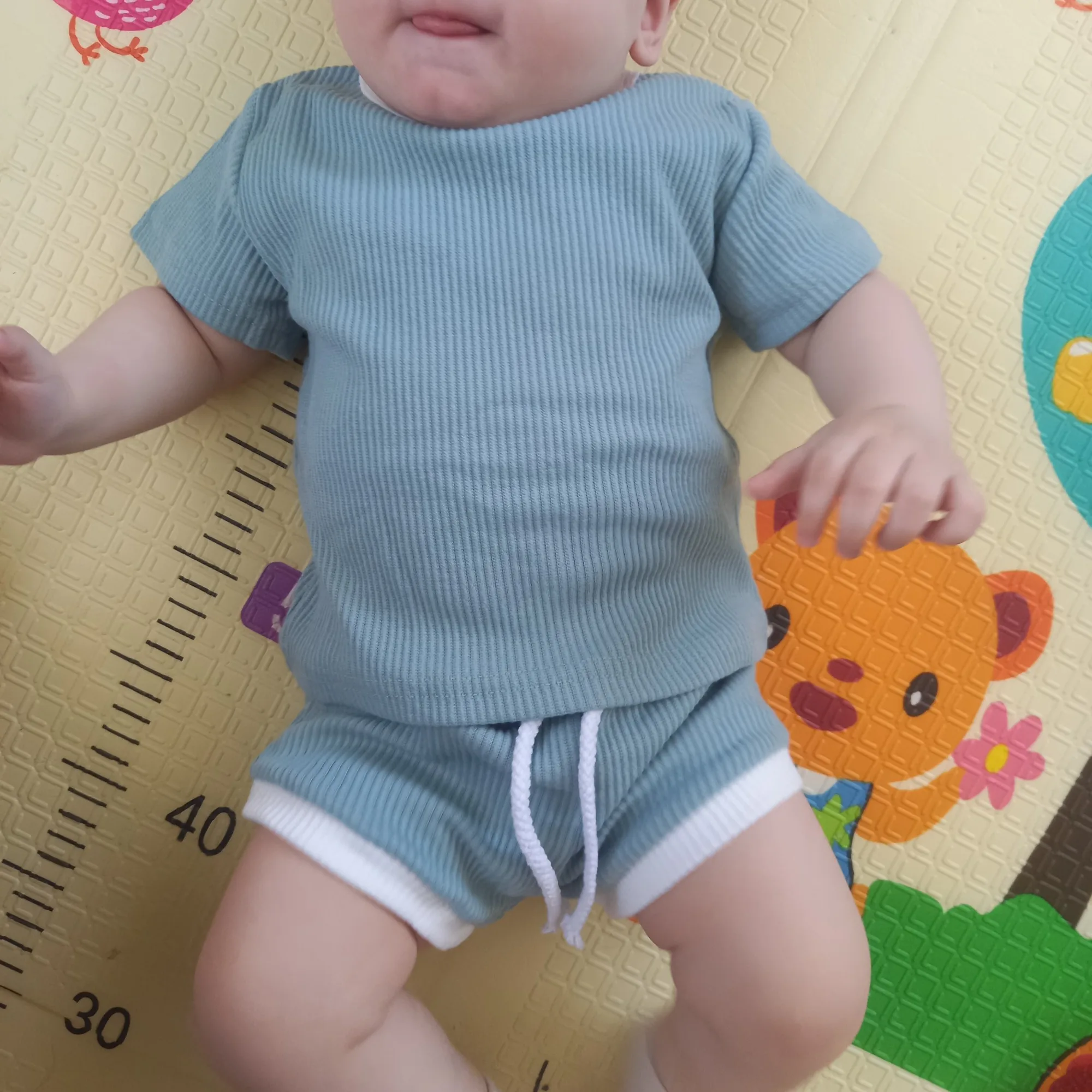 Одежда для новорожденных мальчиков и девочек повседневные хлопковые топы с короткими рукавами, футболка + шорты трикотажный спортивный костюм в рубчик комплект одежды для малышей