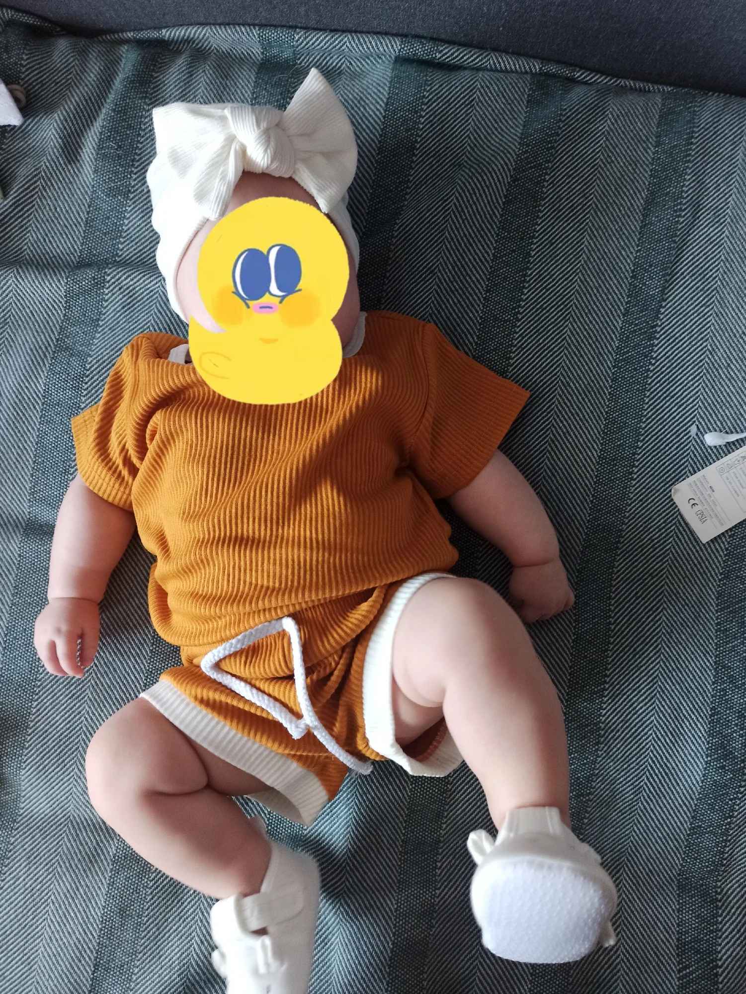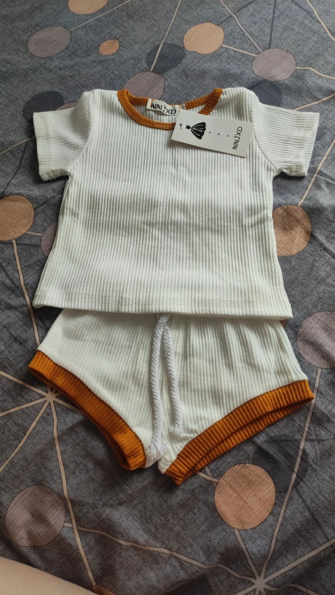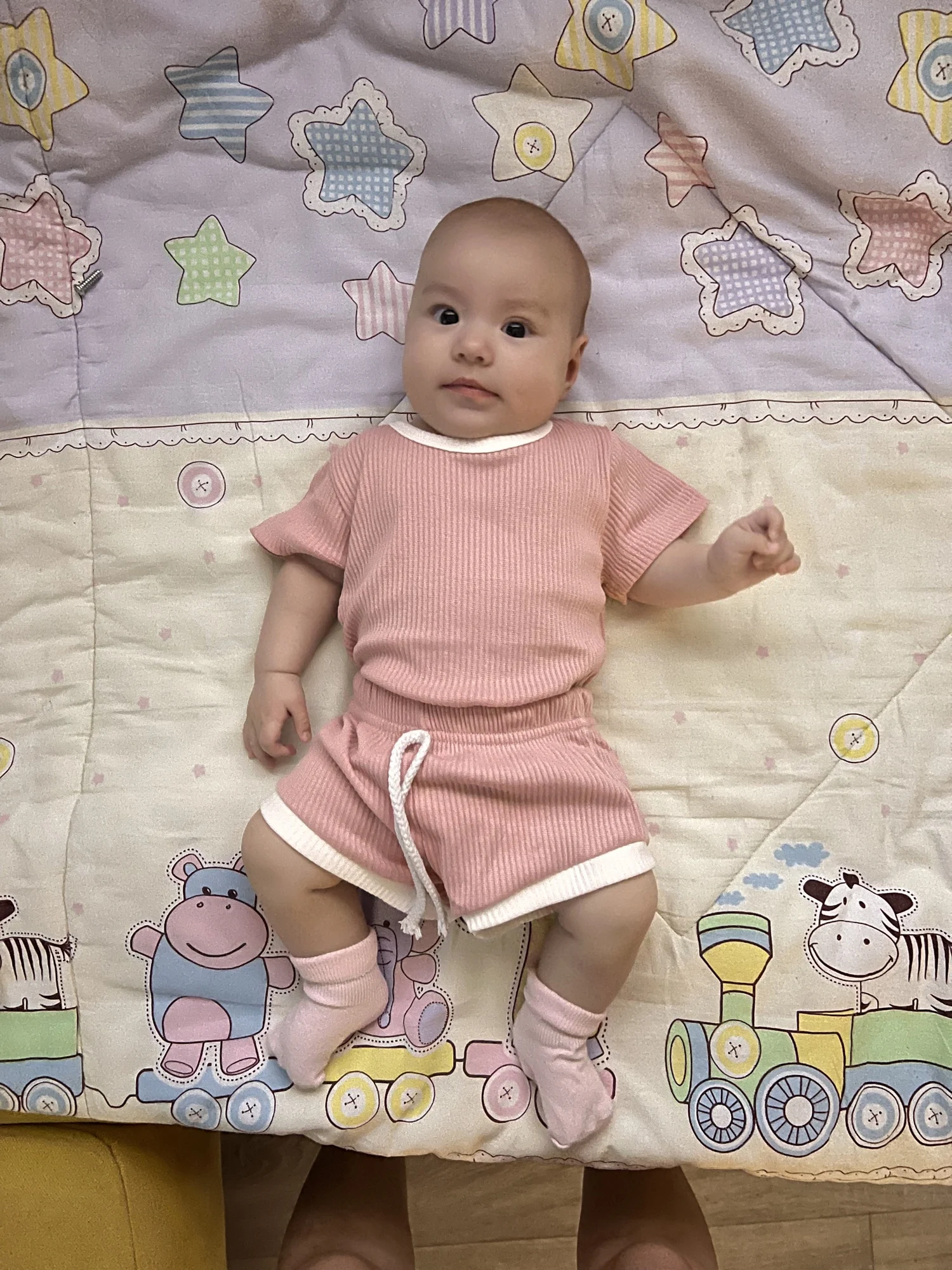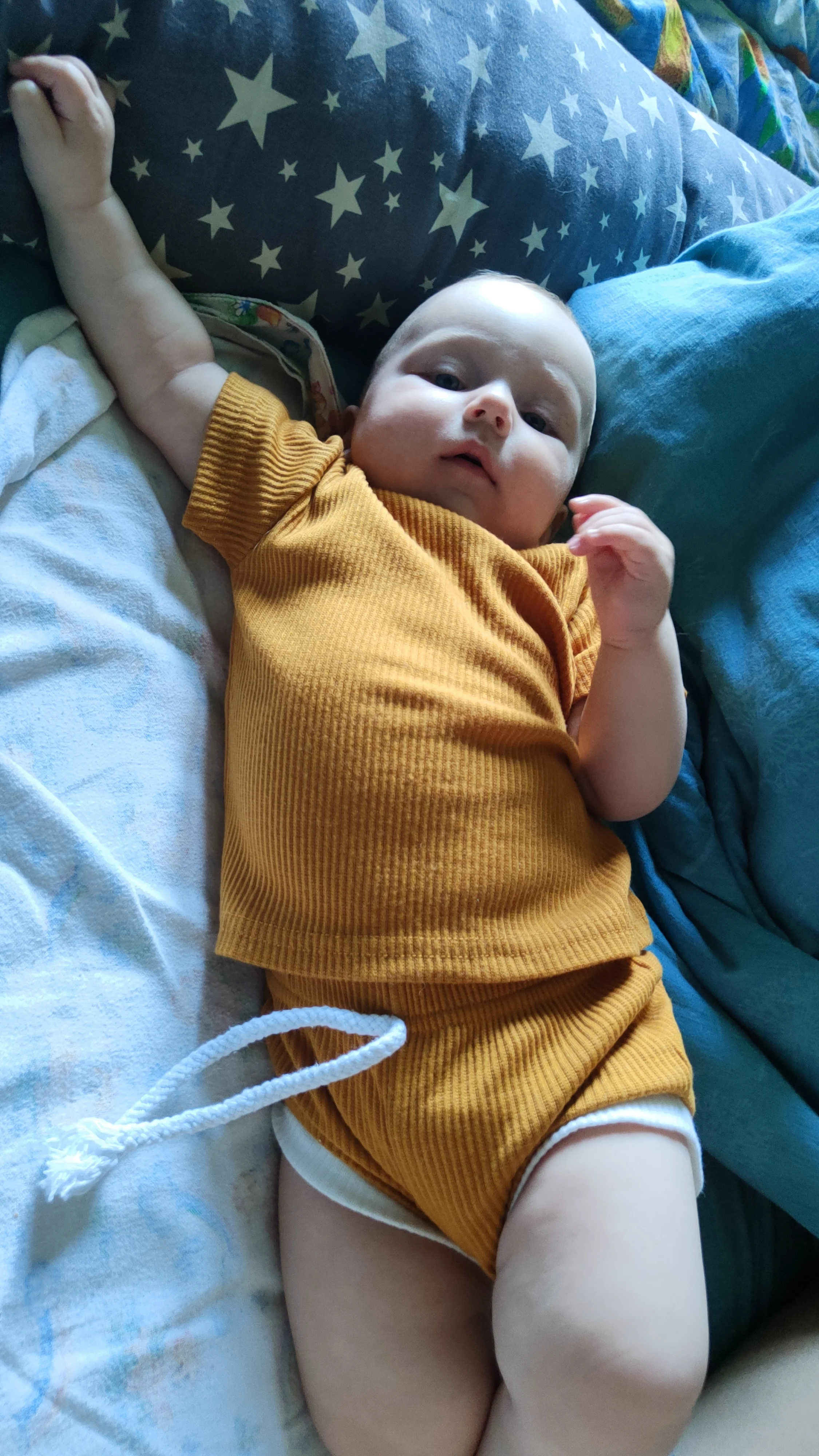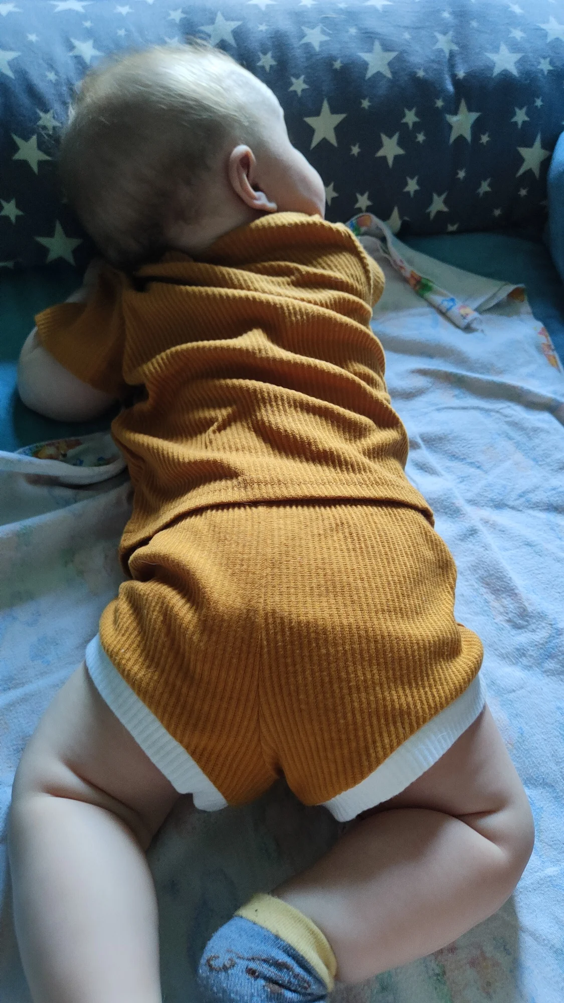 Просто топ. Ткань плотная и отлично тянется - соответственно легко надевать. выглядит шикарно. На шесть месяцев и 8кг село отлично. Памперс правда может выглядывать по бокам шортиков. Фотки неудачные - в жизни круче.