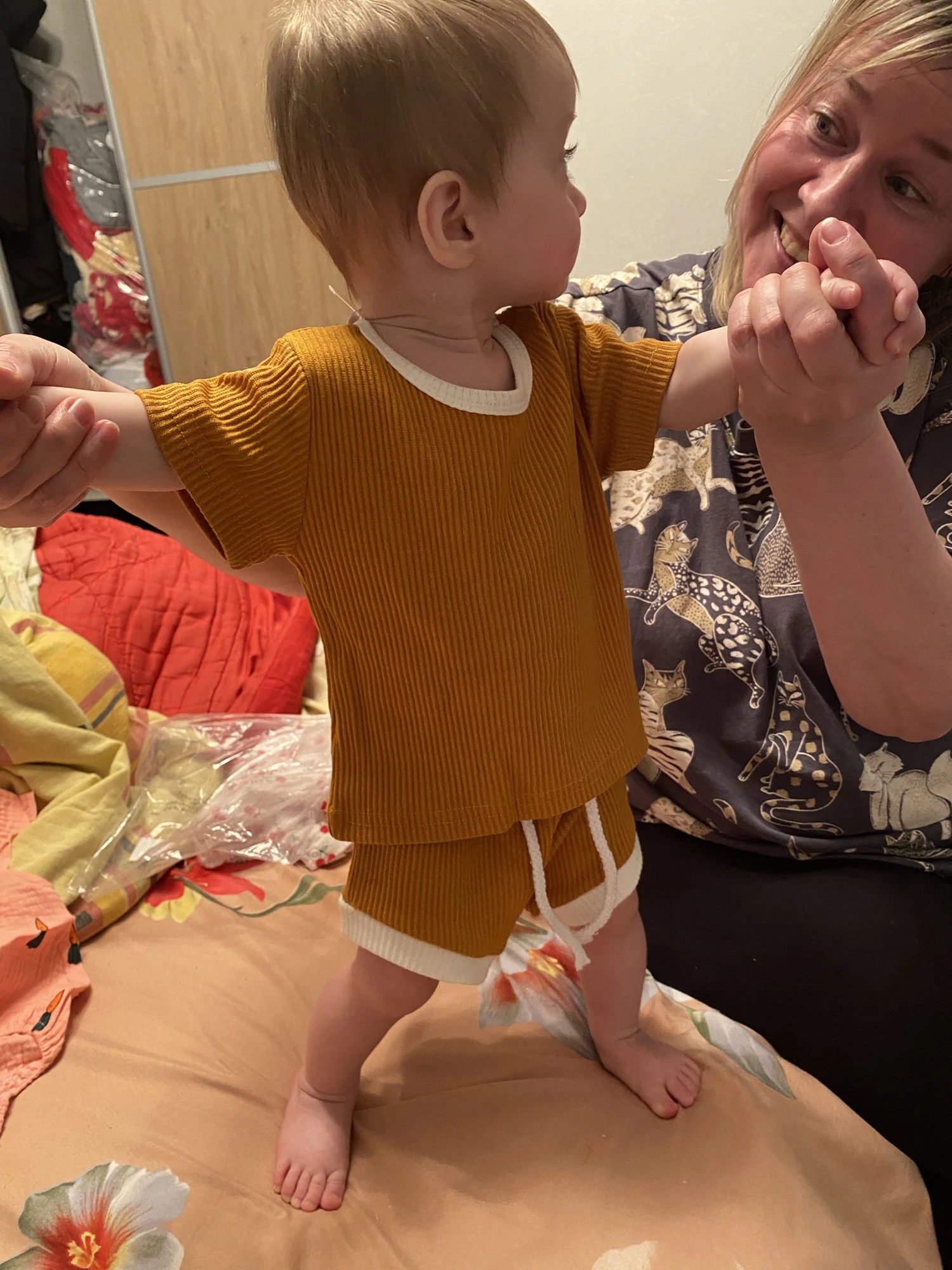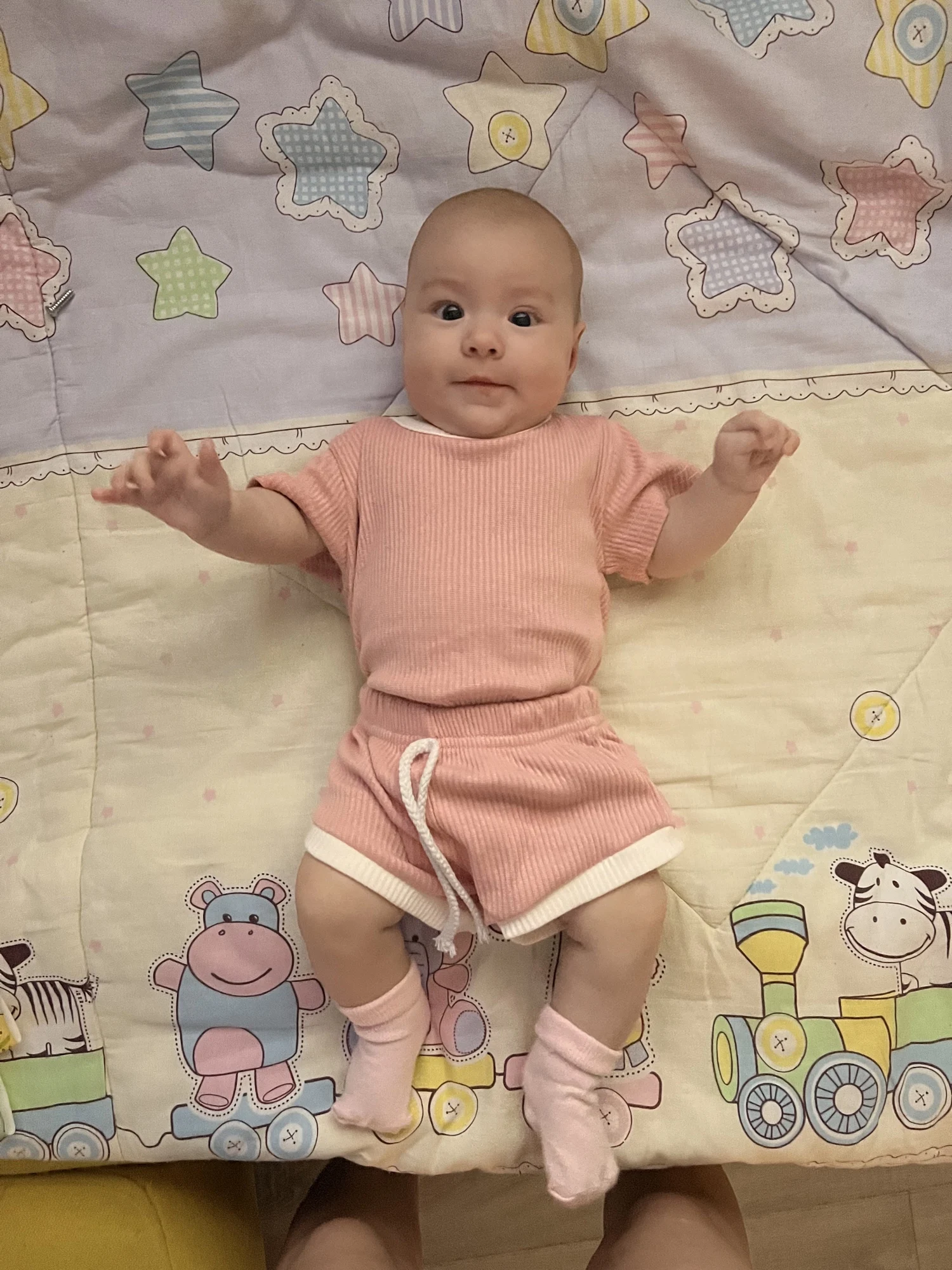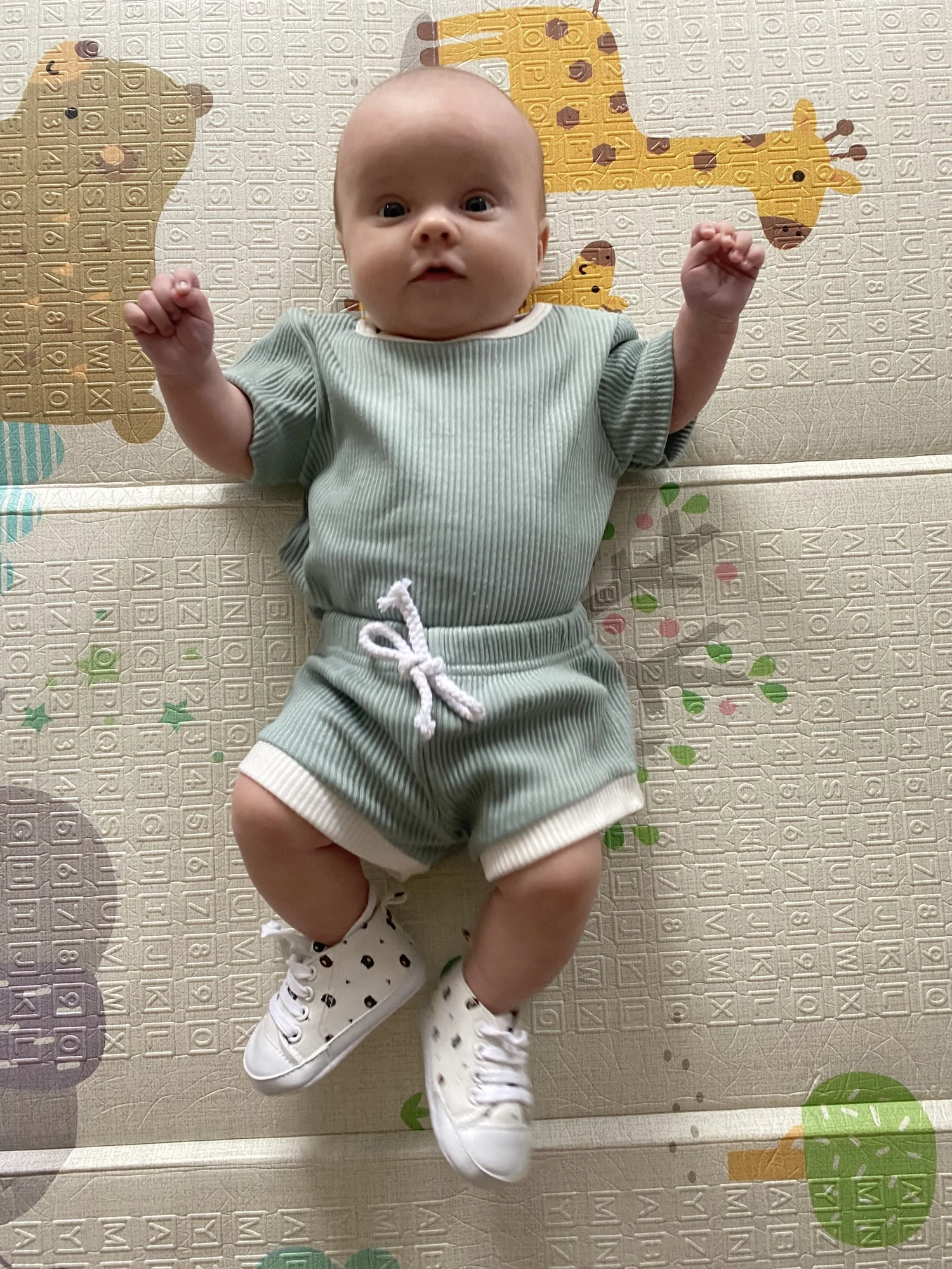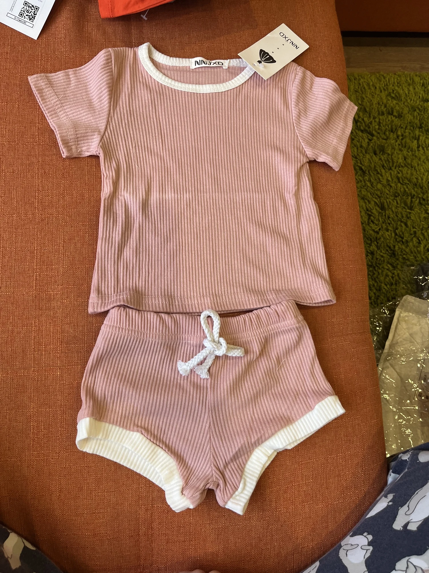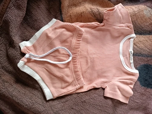 Просто топ. Ткань плотная и отлично тянется - соответственно легко надевать. выглядит шикарно. На шесть месяцев и 8кг село отлично. Памперс правда может выглядывать по бокам шортиков. Фотки неудачные - в жизни круче.