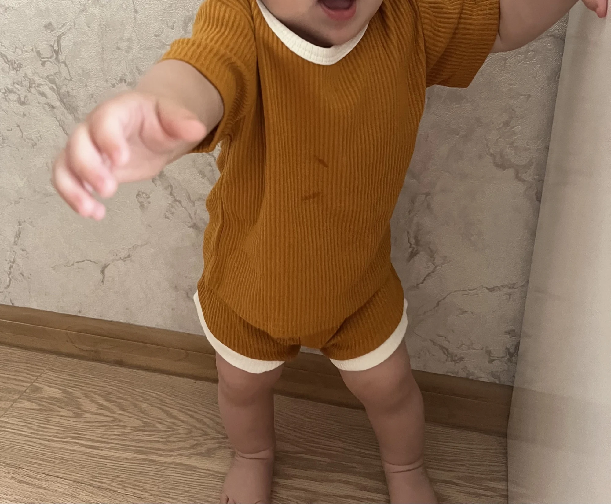 Хороший костюм, мальчику 8 месяцев, рост 72 см, размер брала на годик. Шорты могут не налезть на памперс, с трусиками хорошо