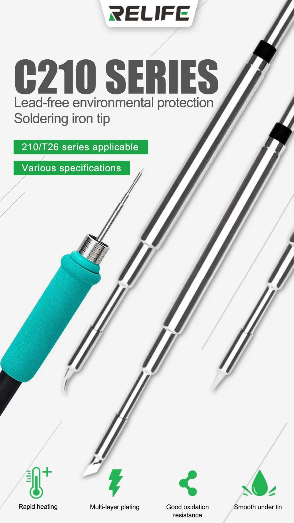 Наконечник для торможения серии RELIFE RL-C2101. Подходит для C210/T262. Нагревание быстро, быстрая теплопроводность3. Оловянная обработка наконечником, легко Оловянная во время пайки и эффективно предотвращает окисление4. После специальной обработки, эффект загрузки олова заранее хорош, нагрузка олова гладкая, а стойкость к окислению сильна