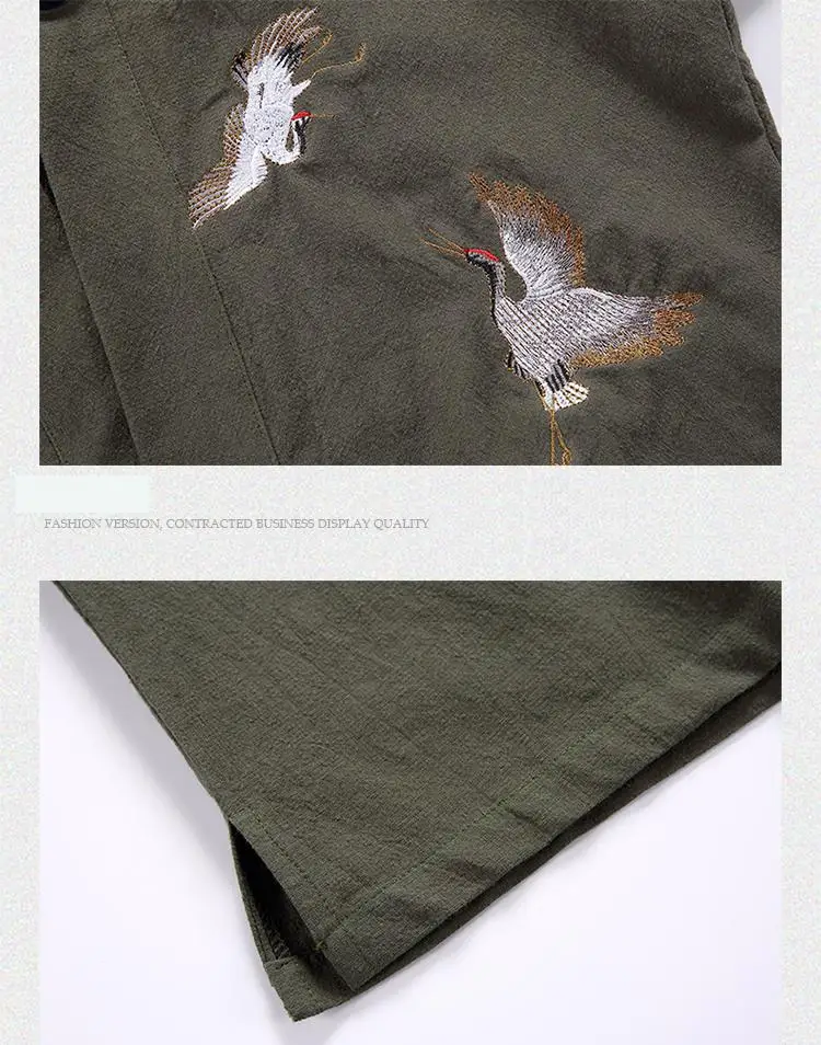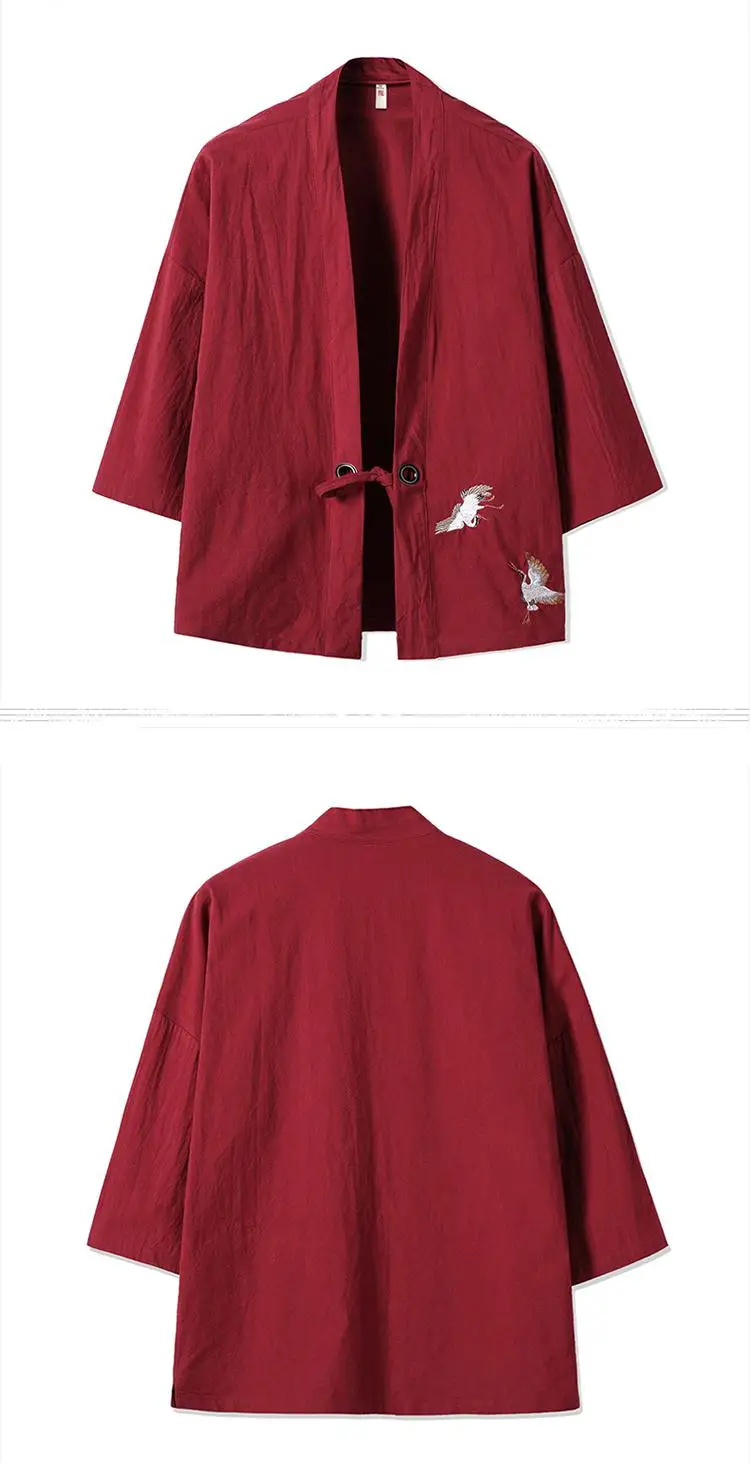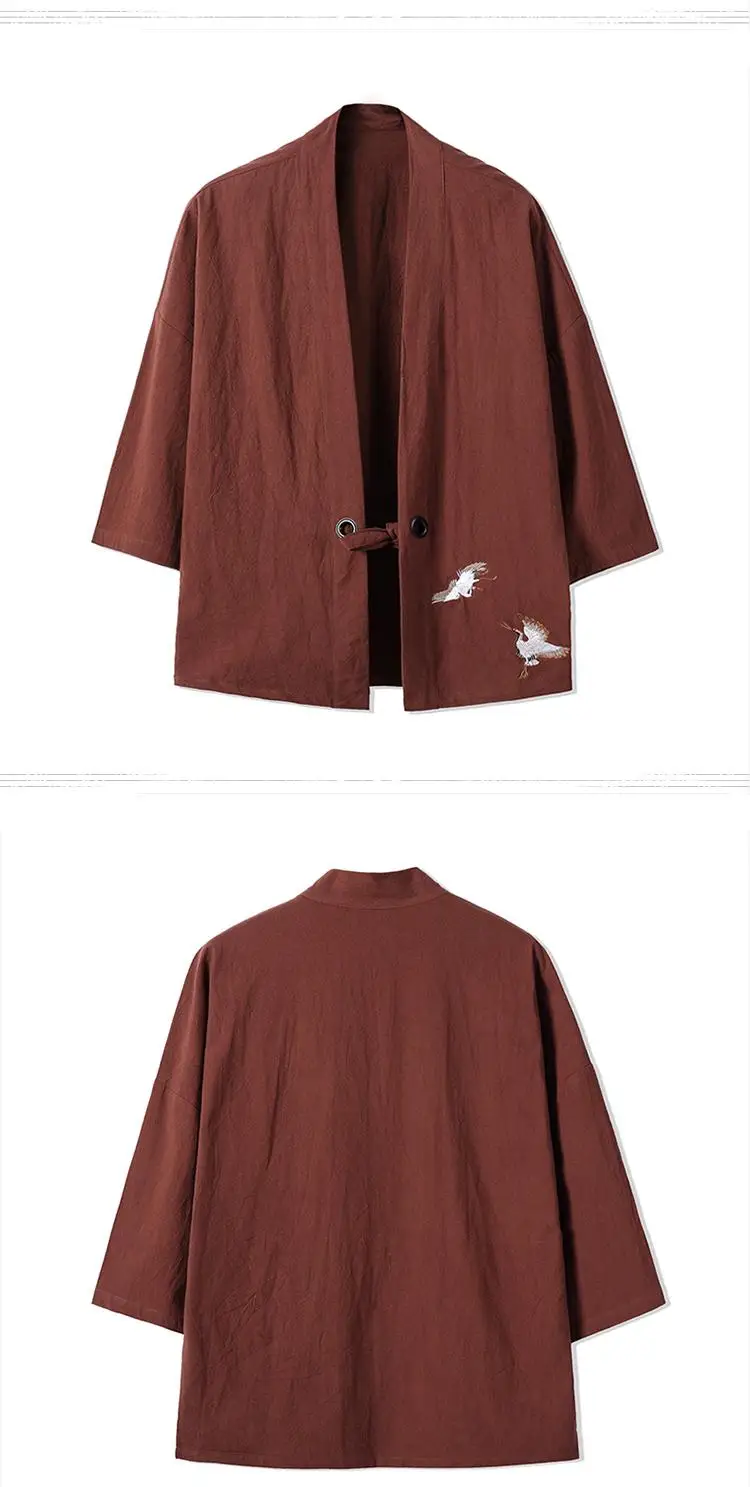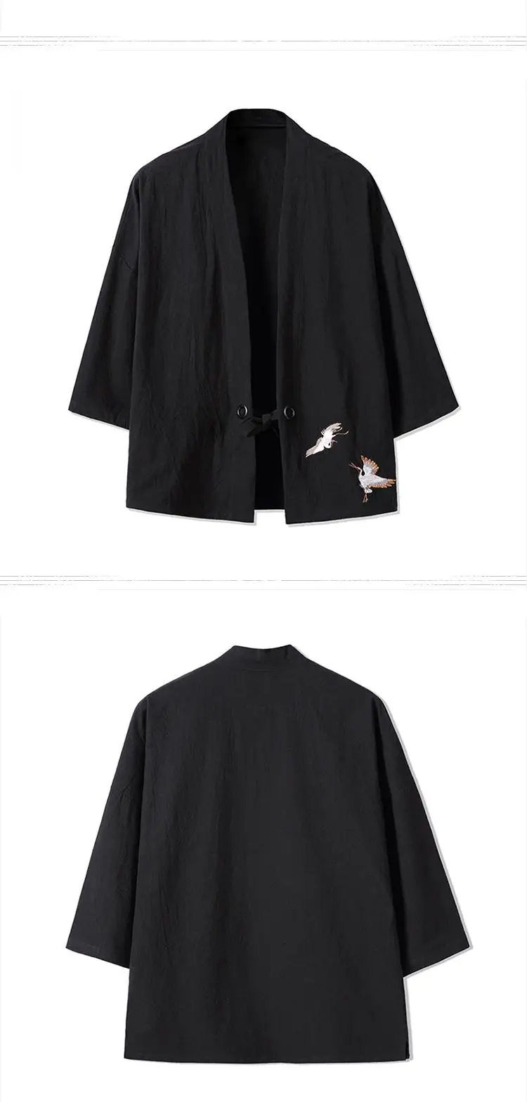 Рубашка-кимоно мужская с вышивкой Журавля, льняная хлопковая рубашка, традиционная открытая стежка, жакет, повседневный костюм в стиле Харадзюку, одежда