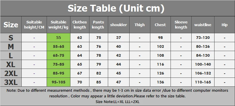 Таблица размеров (единица см) РазмерПодходящая высота/смПодходящий вес/кгДлина одеждыДлина брюк ПлечоБедраГрудьДлина рукаваЛиния талииБедраS-55627537-98-73-120-М-55-65637640-102-80-126-L-65-75647842-108-84-130-XL-75-85657944-116-100-140-2XL-85-115678245-126-106-152-3XL-115-130708547-136-110-165-Примечание: Из-за различных методов измерения возможна погрешность в размере 1-3 см/из-за различий в разрешении компьютерных мониторов цвет может немного отличаться. Пожалуйста, обратитесь к таблице размеров.Примечание по размеру: LL = XL LLL = 2XL