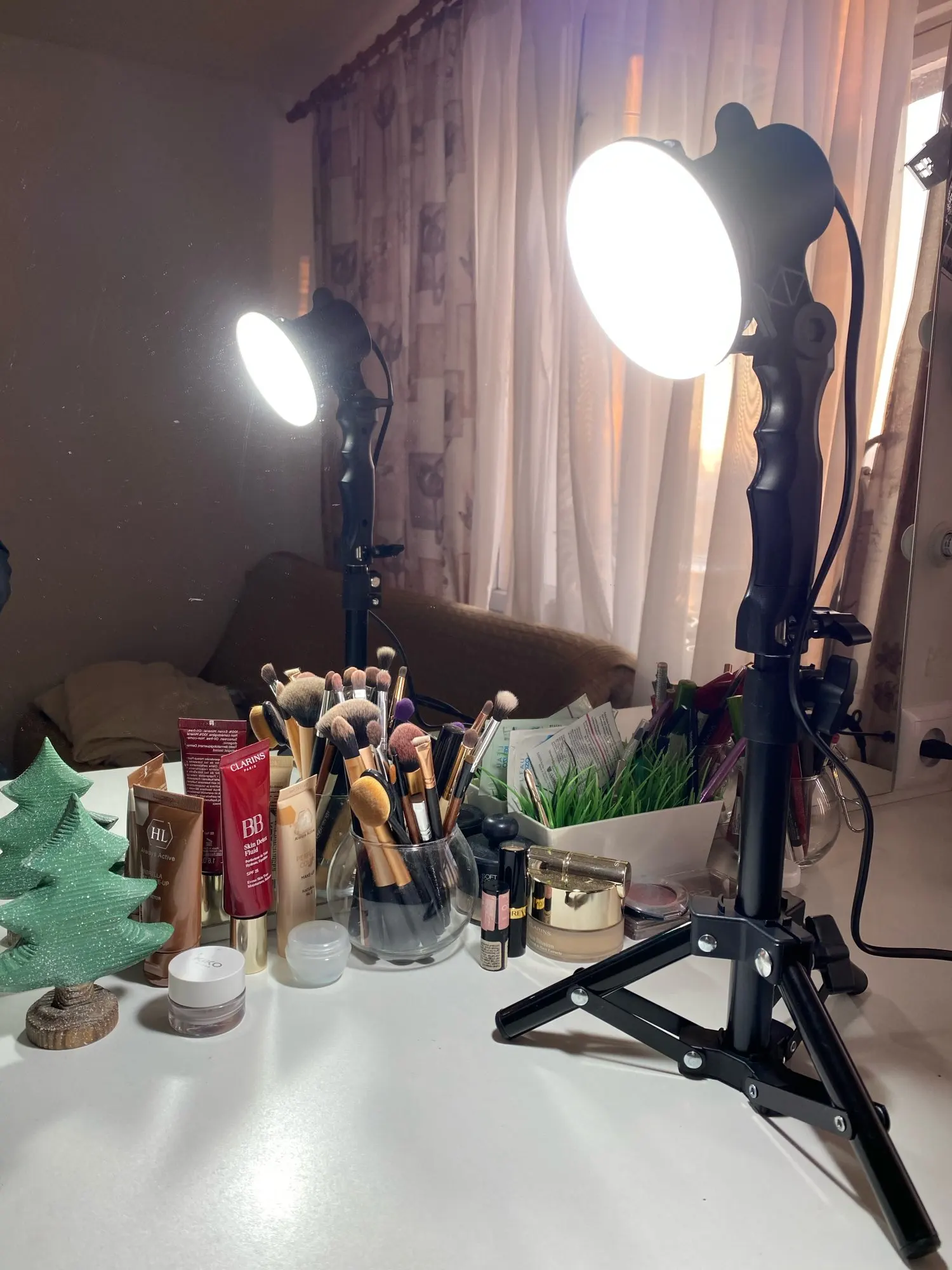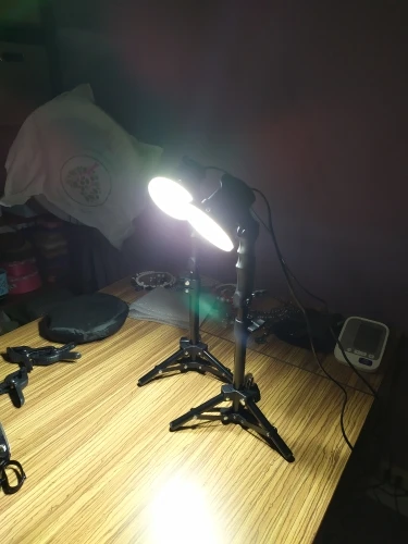 Описание точное,доставка не больше двух недель. Пришло все целое. Штатив устойчивый!!! Лампы светят ярко. Довольна на все 5 из 5.