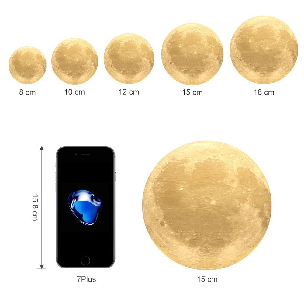 Товар: 3D Лунная лампа Цвет излучения: белый и теплый белый или многоцветный Материал: пла Размер: диаметр 8 см/9 см/10 см/12 см/13 см/14 см/15 см/18 см/20 см Входное напряжение: 5 В постоянного тока Мощность: 0,5 Вт Источник питания: литиевая батарея (встроенная) Емкость литиевого аккумулятора: 250 мАч Время использования лусветильник: время использования лунного ночника очень длительное, полная зарядка займет около 3 часов, ночник с 3d-печатью можно использовать через 5-20 часов после полной зарядки (иногда зависит от яркости) Тип переключателя: сенсорный Источник светильник: светодиодный источник светильник (желтый/белый светильник свободно переключается, регулируемая яркость) Как использовать: Коснитесь нижнего интерфейса, чтобы включить/выключить и изменить цвет светильник, длительное нажатие для регулировки яркости Подходит для: освещения, декора, подарков