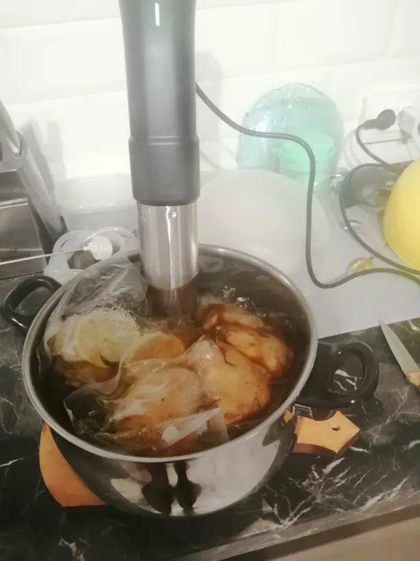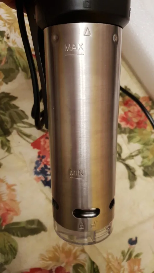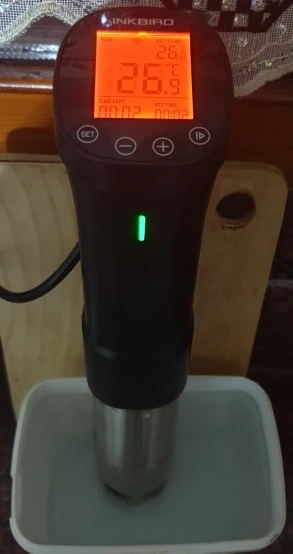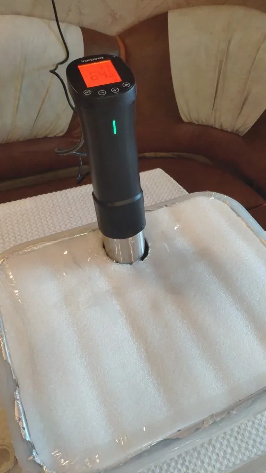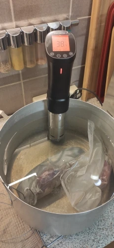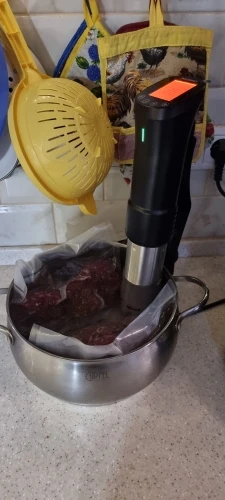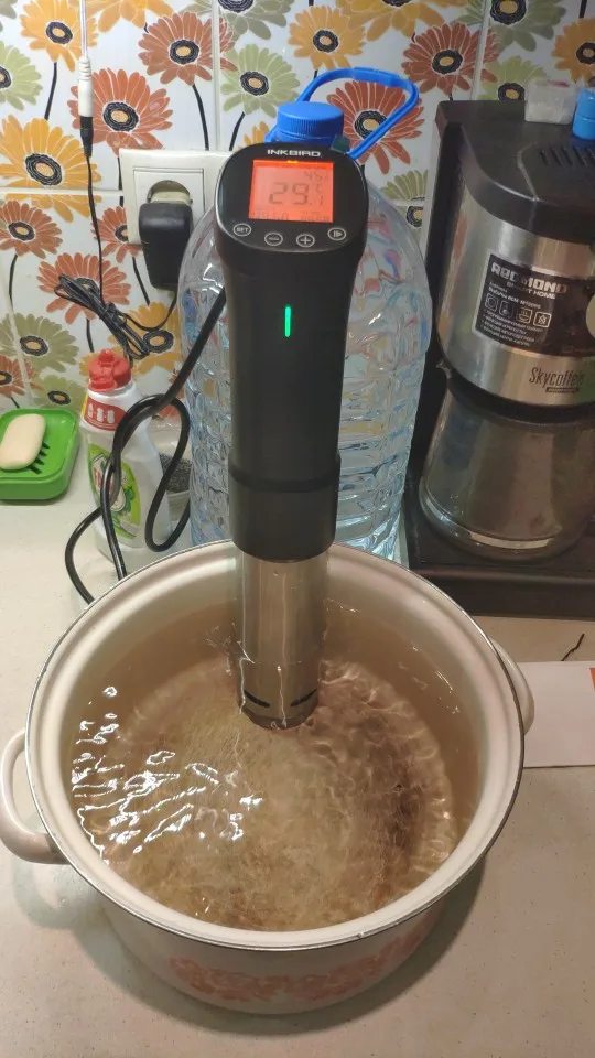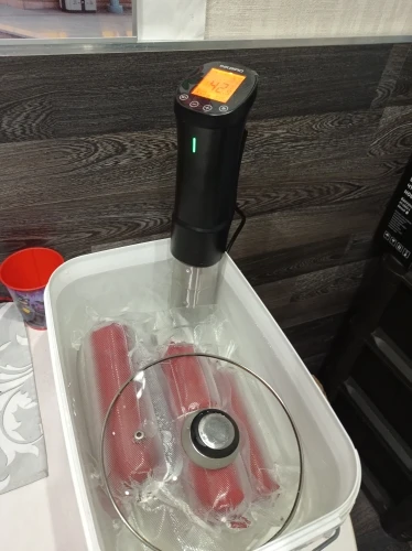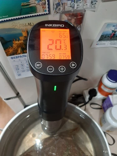 Отличная вещь! Я очень доволен. Вкусно получается. Надо только сделать (или найти готовую) решётку на дно кастрюли, чтоб снизу тоже циркулировала вода. И желательно решетку сверху с грузом, чтобы пакет не всплывал. Учтите, пока температура не дойдет до выставленной, таймер не включится! Еще желательно сделать крышку к кастрюле, чтоб вода не так быстро испарялась. И подливать воду подогретую до нужной температуры.