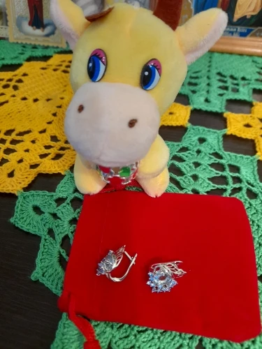 16 января заказала серёжки, а 22 января забрала с почты. Серёжки очень яркие, красивые. Хороший сплав, не вызывает аллергию. Приехали в красном мешочке да ещё дополнительно был подарок: символ года - бычок.