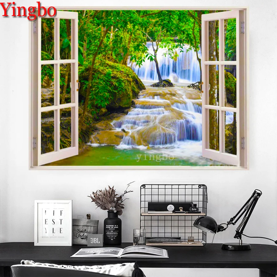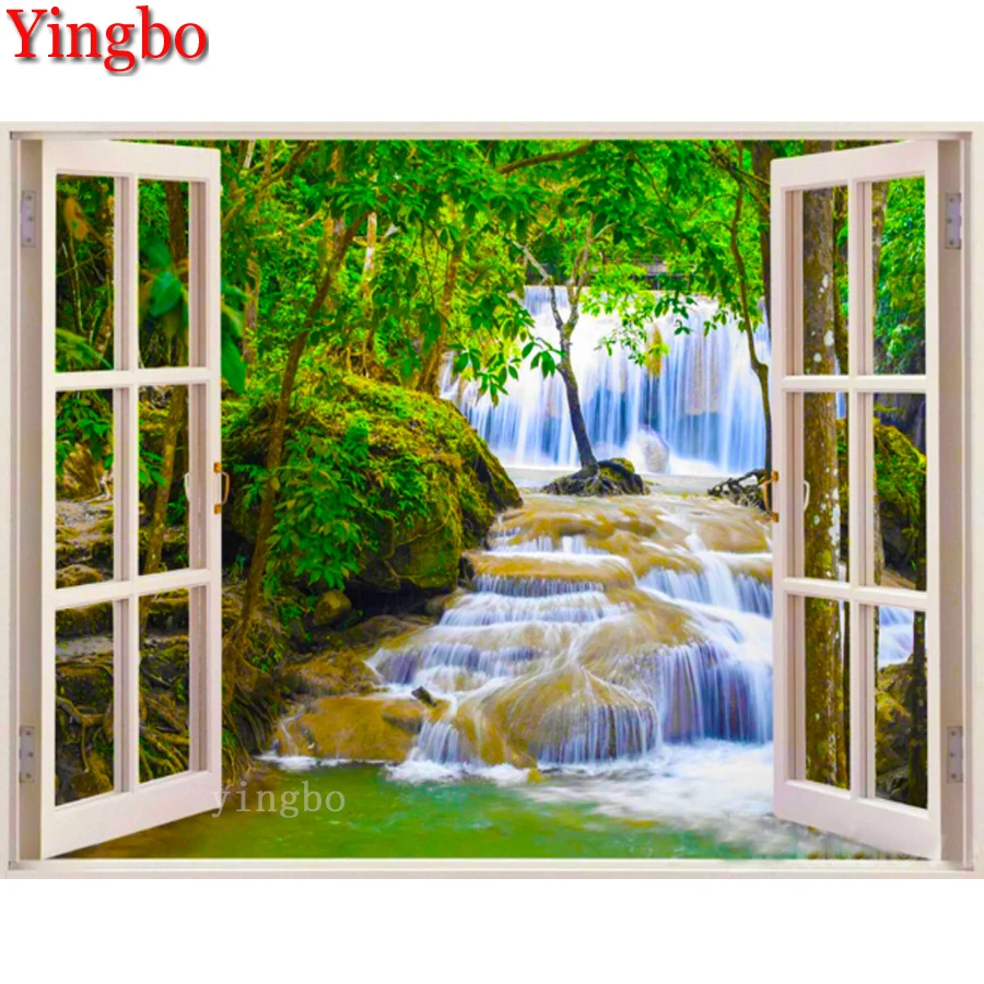 Водопад, лес, окно, пейзаж, сделай сам, Алмазная мозаика, алмазная вышивка, полностью квадратная круглая дрель, ручная работа, Декор