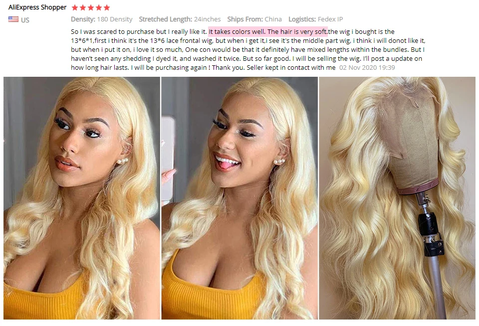 Поэтому я был болен покупать, но мне это очень нравится. Он хорошо принимает цвета. Очень мягкие волосы. Парик, который я купил, это парик 13*6*1, сначала я думаю, что это парик с фронтальным кружевом 13*6, но когда я его получу, я вижу, что это парик средней части, Я думаю, что мне это не понравится, но когда я его надену, мне это очень нравится, Один con будет в том, что он определенно имеет смешанные длины в пучках. Но я не увидел ни одного падения, я покрасить его, и помыл его дважды. Но до сих пор хорошо. Я буду продавать парик. Я оставлю обновленную информацию о том, как долго держится волос. Я буду покупать снова! Спасибо. Продавец связался со мной