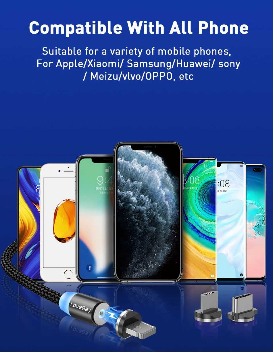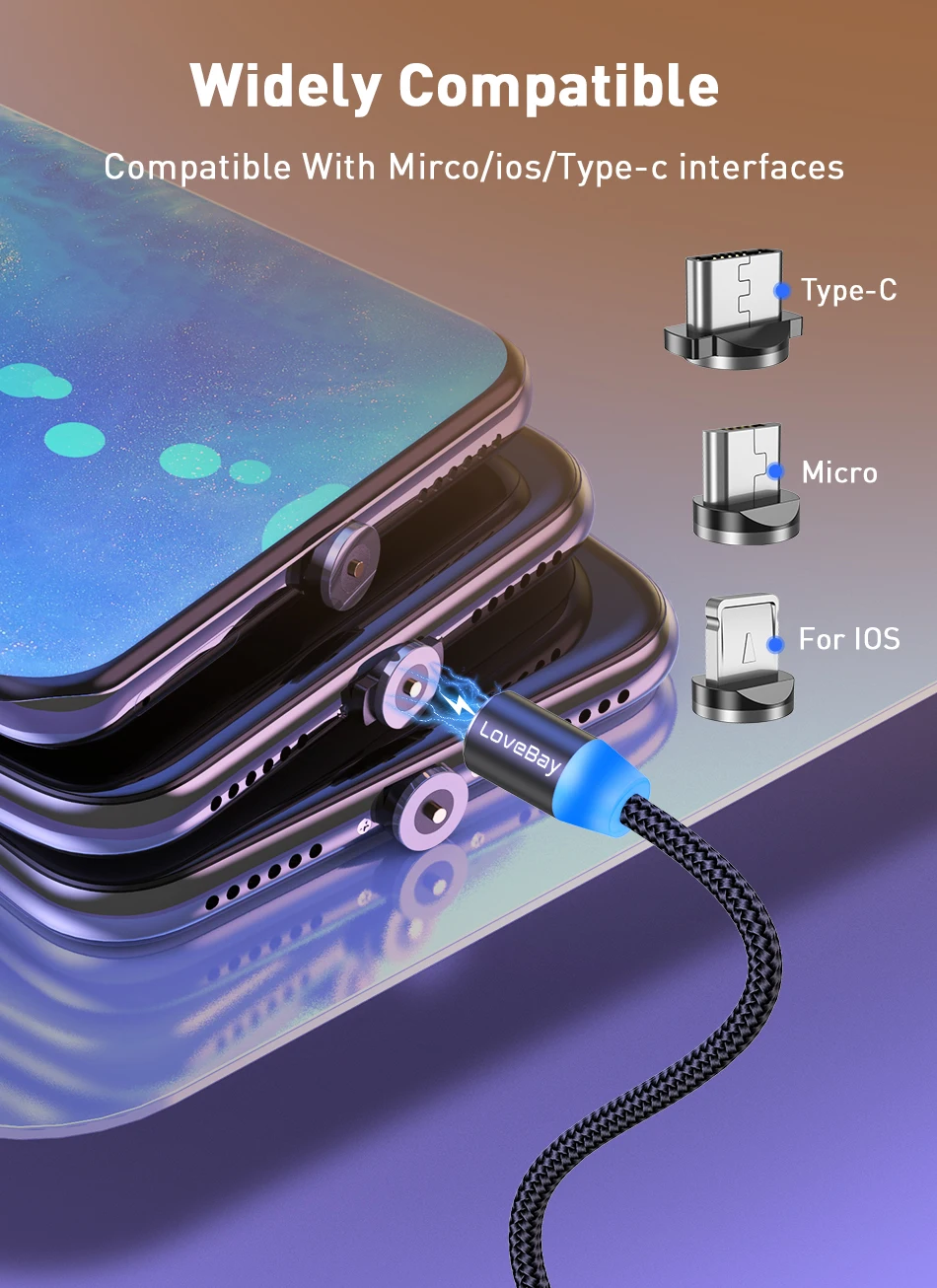 Магнитный USB-кабель Lovebay, светодиодный кабель для быстрой заряд...