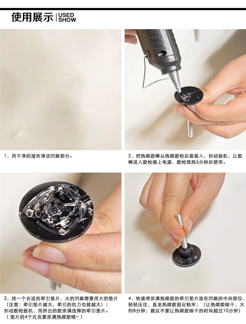 5. Быстро поместите тяговую подкладку, покрытую термоплавким клеем, в центр вмятины и аккуратно прижмите ее до тех пор, пока клей горячего расплава не затвердевается и не приклеится плотно; (Дайте термоплавкому клею высохнуть около 8 минут; Мы рекомендуем не допустить, чтобы термоплавкий клей не высыхал более 10 минут)