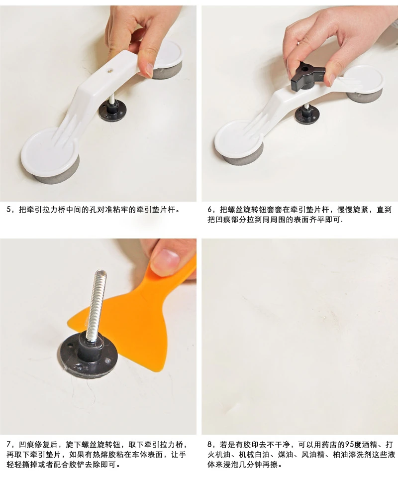 9. После ремонта вмятин Открутите винтовую ручку, снимите Тяговый мост, а затем снимите тяговую шайбу. Если на поверхности кузова автомобиля прилипает клей горячего расплава, просто оторвите его руками.