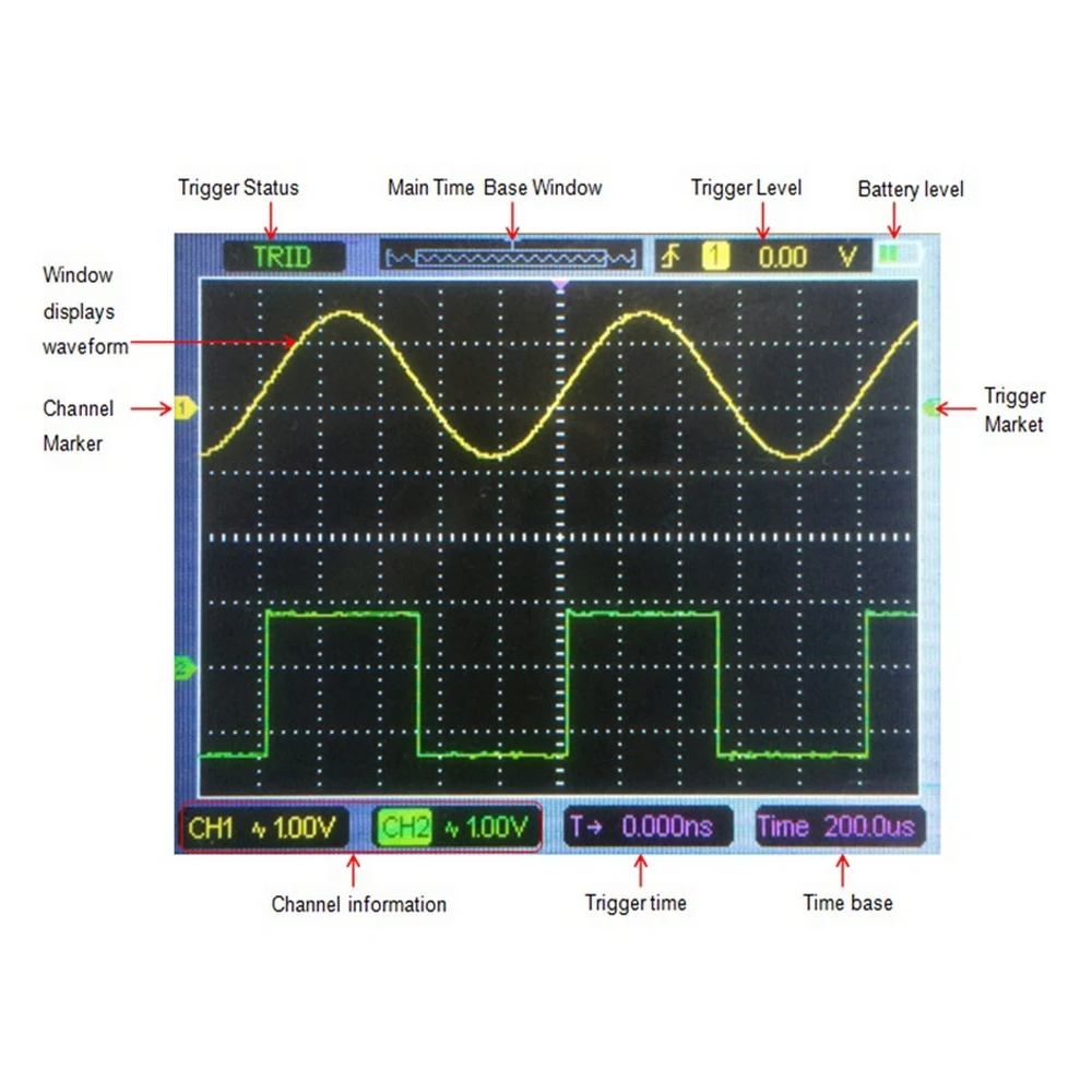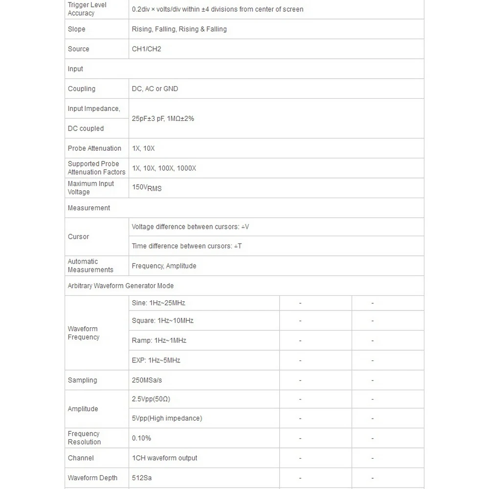 Особенности:1. Осциллограф + генератор сигналов + мультиметр: Эта многофункциональная станция имеет три универсальных функции измерительного инструмента. Это исходящий правый продукт для инженеров.2. Интеллектуальное управление зарядкой: его литиевые батареи могут быть перезаряжены byeither высокого current-5V/2A или обычный компьютерный USB интерфейс. Позволяет во время зарядки, во время использования, очень удобно и удобно;3. Ультра-низкая мощность: интерфейс зарядки типа C, после каждой перезарядки в течение 2 часов, устройство может использоваться непрерывно в течение полного дня или в режиме ожидания более двух месяцев;4. Большой емкости литиевая батарея Источник питания: 18650 сменная литиевая батарея, без замены батареи;5. Зарядное устройство 5 В/2 А + зарядный кабель типа C: Питание типа C + интерфейс передачи данных, может передавать зарядное устройство и кабель передачи данных на ваш мобильный телефон;6. Автоматический тест на один ключ: магический инструмент и основная функция для тестирования новичка;7. Малый объем, одна рука держания: 45 градусов конструкция подвески обеспечивает вам рабочую станцию в любом месте в любое время;8. Одна ключевая страница, быстро сравнить две группы опорных форм + 6 групп хранения сигналов, простой и эффективный;9. Функция цифрового вольтметра: Автоматическое Измерение частоты и амплитуды, удобное и беззаботное;10. Функция измерения курсора поддерживает измерение времени и напряжения вручную и точно измеряет требуемые формы волны;11. Одно нажатие переключает меню на китайском и английском языках;12. Цветной ЖК-экран: изысканные и гладкие линии делают формы волны прозрачными и неискаженными при увеличении;13. Минималистичный дизайн клавиатуры упрощает работу, удобен в использовании;14. Корпус Unibody: приятное на ощупь, благоприятное ударопрочность, отличная термостойкость, легко разбирается;15. Функция самокалибровки: без смещения уровня после длительного использования;16. Универсальная функция мультиметра: напряжение, ток, сопротивление, диод, конденсатор, испытание ВКЛ-ВЫКЛ;17. Функция выходного сигнала генератора сигналов: синус выхода, квадрат, треугольник, трапециевидный и другие формы волны; Синус до 25 МГц;18. Функция видео помощи: сканирование кода на обратной стороне машины, чтобы получить помощь видео курса;19. На программное обеспечения для подключения к компьютеру с поддержкой windows7/8/10 32-битными и 64-битными.Характеристики:Функции осциллографа:ГоризонтальныйДиапазон дискретизации: 250MSA/s (одноканальный), 125MSA/s (двухканальный)Интерполяция формы волны: (sin x)/xДлина записи: макс. 6K для одного канала; 3K образцы на два каналаДиапазон сек/див: 5ns/DIV ~ 500s/div 1, 2, 5 последовательностейВертикальныйАналого-цифровой преобразователь: 8-бит, каждый канал выборку одновременноДиапазон Вольт/див: 10 мВ/див ~ 10 В/диват вход BNCПредел полосы пропускания, типичный: 20 МГцНизкочастотная характеристика (-3 дБ): ≤ 10 Гц на BNCВремя подъема на BNC, типичный: ≤ 5nsТочность усиления постоянного тока: ± 3% для нормального или среднего режима сбора, от 10 В/див до 10 мВ/ДивПримечание: При использовании зонда 1X пропускная способность уменьшается до 6 МГц.ПриобретениеРежимы приобретения: нормальныйТриггерТип: крайРежим: Авто, нормальный, одиночныйУровень: ± 4 деления от центра экранаТочность уровня срабатывания: 0,2div X Вольт/div в пределах ± 4 деления 