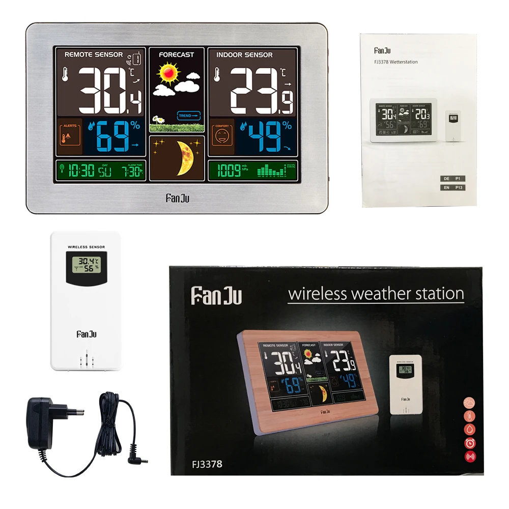 Особенности: [Метеостанция] может предсказать погоду в течение следующих 8 часов: солнечный, облачный, пасмурный, пасмурный, светильник, дождь (снег), сильный дождь (снег). [Уличное/внутреннее использование] возможность контролировать температуру в помещении и на улице, влажность одновременно. Знайте внешнюю погоду, просто взглянув на устройство. [Практическая функция] время может быть установлено в течение 12/24 часов; Переключаемые единицы между Цельсия и фаренгейтом; Индикаторы уровня комфорта могут отображать Пять условий от комфортного до неудобного. [Поддерживает до 3 датчиков] Эта Погодная станция позволяет 3 беспроводных датчика работать одновременно. Вы можете купить еще два датчика для контроля температуры в разных местах. [ЖК-подсветка] подсветка может включаться в течение 15 с при питании от батарей; И с регулируемым уровнем яркости 4, она может держать освещение при питании от адаптера. [Легкая зарядка] основная станция имеет один usb-порт для зарядки электронных устройств при подключении адаптера питания. [Два места для его размещения] его можно разместить двумя способами, которые можно повесить на стену или разместить на столе. Примечание: * Батарея в комплект не входит. * Появляется символ оповещения о льду и звуковой сигнал, когда наружная температура на 30 ℉(-1 ℃)~ 37 ℉(2 ℃). * В комплект входит только один датчик. * Прогноз погоды: Погодная станция использует встроенный датчик давления воздуха для прогноза погодных условий в течение следующих 8 часов. Текущий экран не отображает погоду в реальном времени. Мы рекомендуем использовать местные профессиональные прогноза погоды в качестве точной информации. Технические характеристики: Цвет: серебристый/деревянный/черный (опционально) Материал: АБС-пластик Тип вилки: штепсельная вилка европейского стандарта Диапазон измерения температуры в помещении: 14 ℃ (-10 ℃) ~ 122 ℃ (50 ℃) Наружные диапазоны измерения температуры: -40 ℃ (-40 ℃)~ 122 ℃ (50 ℃) Диапазон измерения влажности в помещении и на улице: 20% RH ~ 95% RH Барометрические диапазоны измерения давления: 600 hPa/mb ~ 1100 hPa/mb & 17,72 inHg ~ 32,48 inHg Единицы измерения барометрического давления: mb/hPa или inHg (опционально) Единицы измерения температуры: ℃ / ℉ (опционально) Аккумулятор: 2 * AA (батарея в комплект не входит) Размер изделия: 20,5*3*13 см/8,07*1,18*5,11 дюймов Посылка Размеры: 21,6*6,5*14,5 см/8,5*2,55 * 5.7in Вес изделия: 500 г/17,63 унций Вес посылка: 550 г/19,40 унций Упаковочный лист: 1 * Погодная станция 1 * адаптер штепсельной вилки европейского стандарта 1 * Сенсор 1 * Руководство пользователя