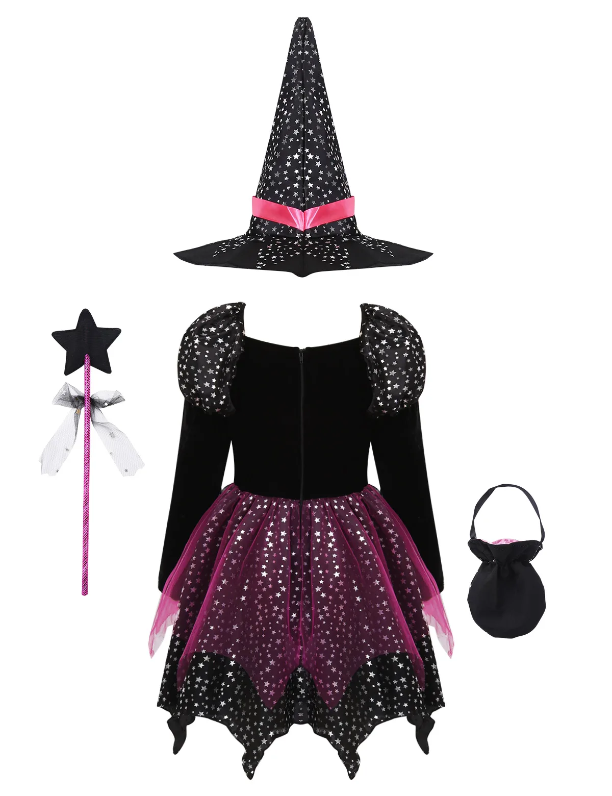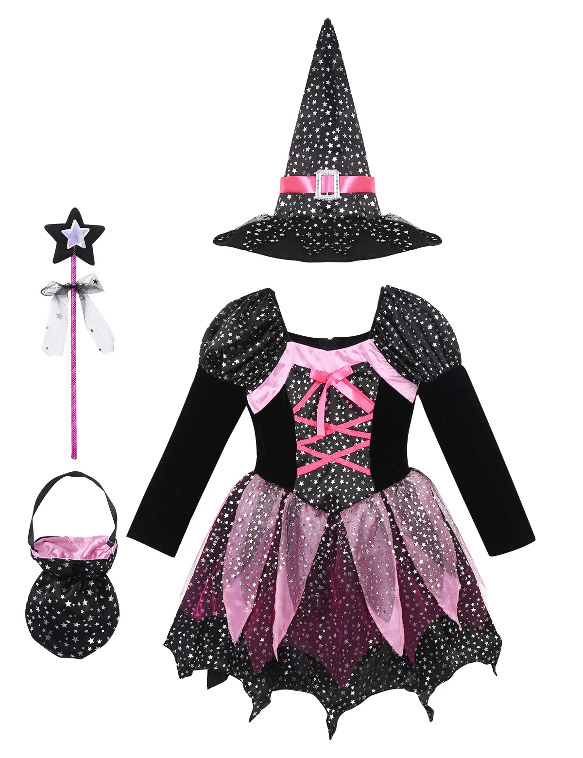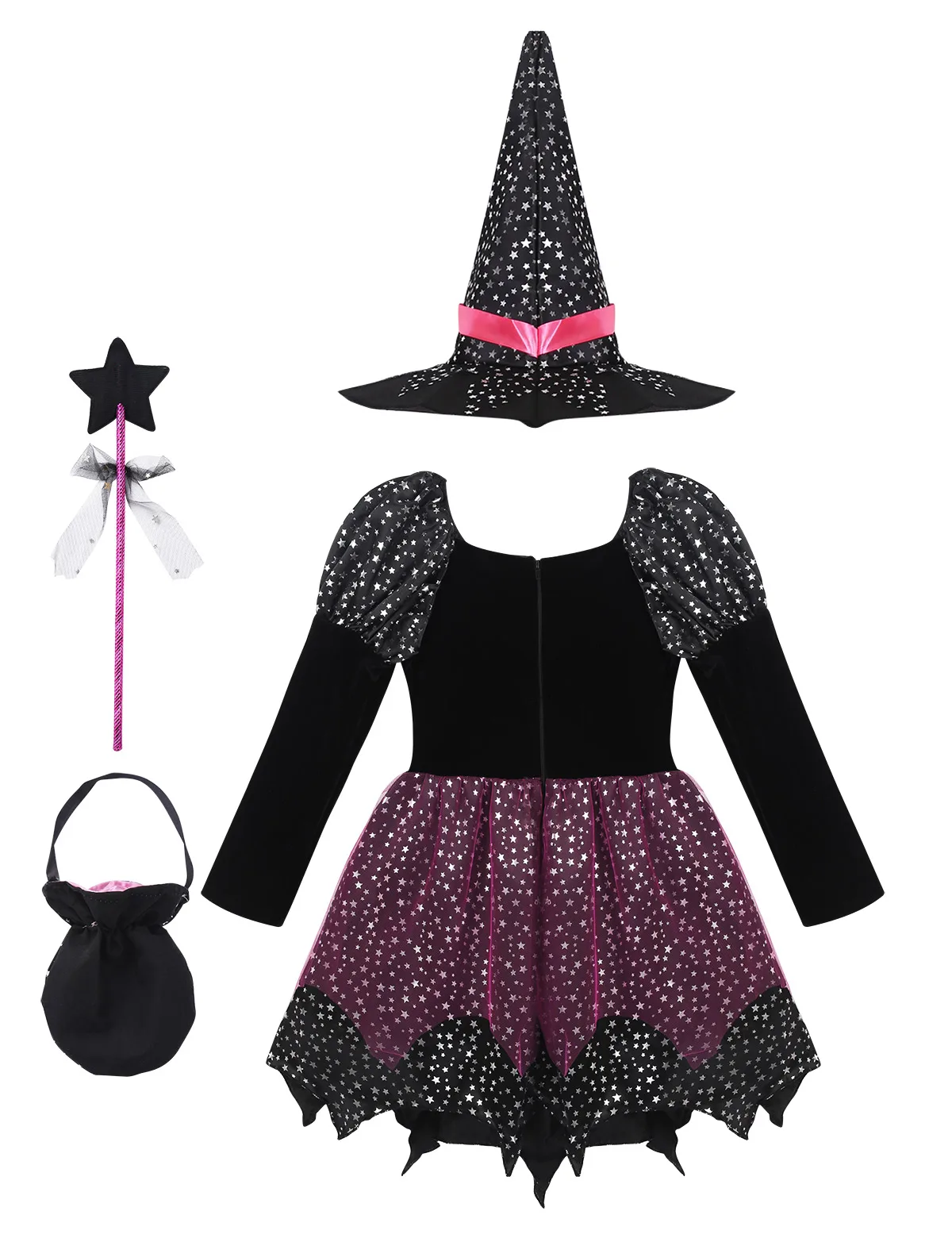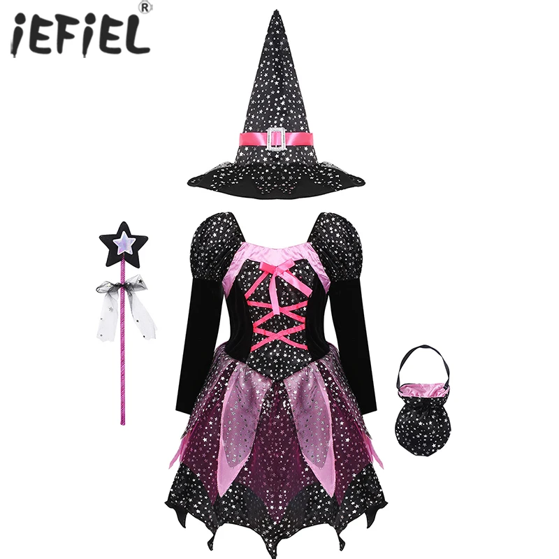 Костюм ведьмы для девочек, для карнавала, Хэллоуина, с серебряными звездами и остроконечной шляпой, платье с жезлом