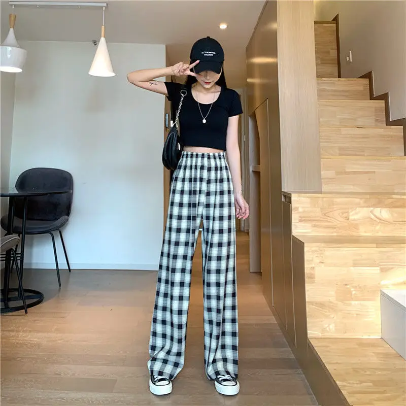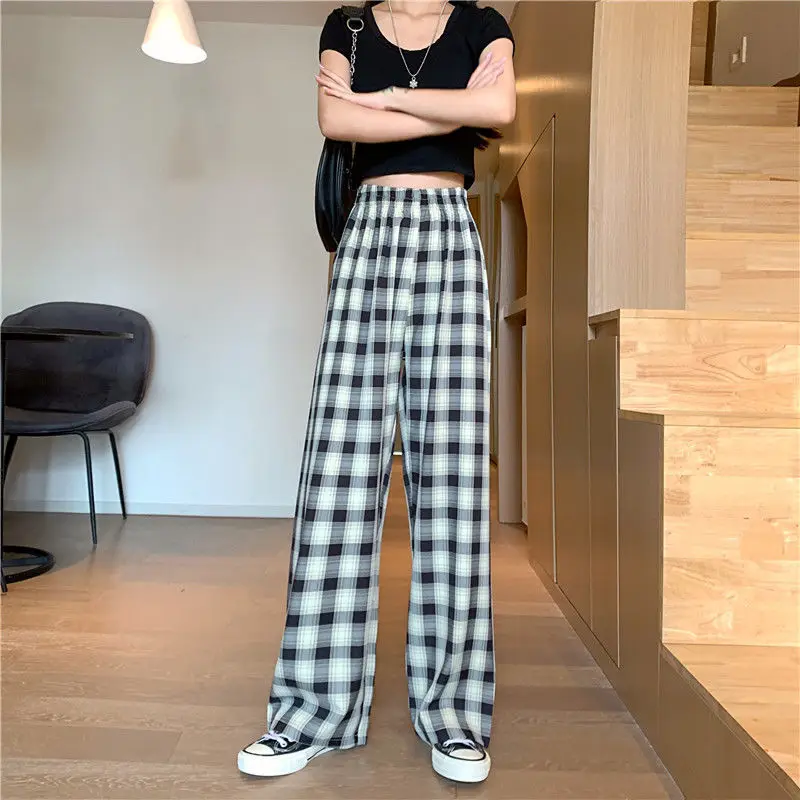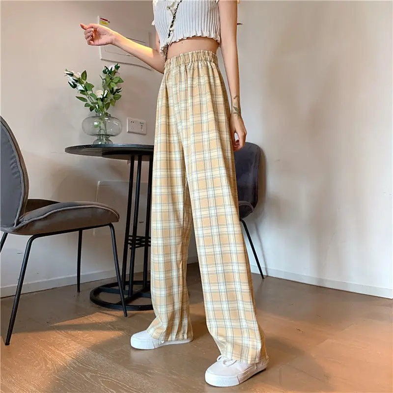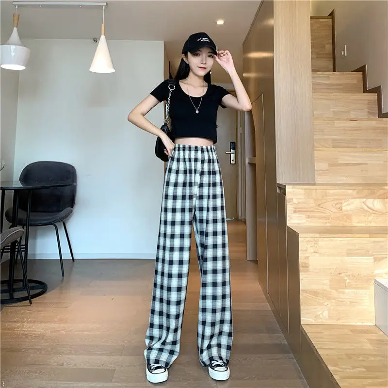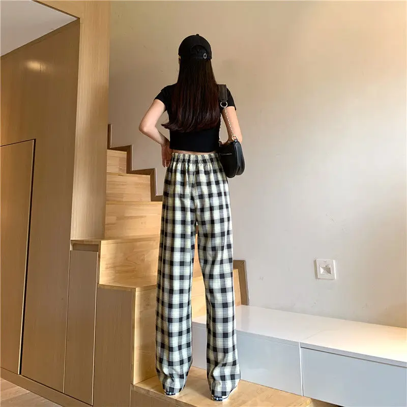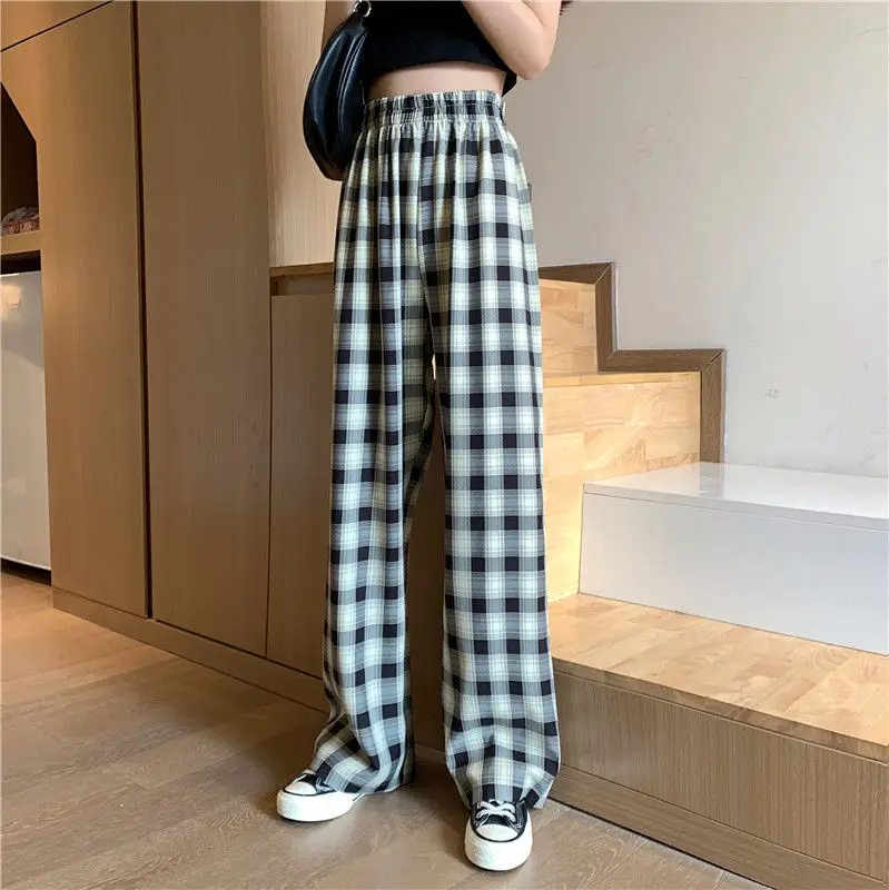 Клетчатые свободные прямые брюки с широкими штанинами осень 2020 новый стиль драпировка тонкие с высокой талией повседневные брюки женские спортивные штаны