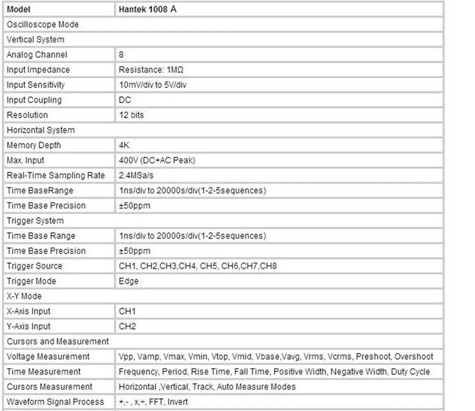 Hantek Осциллограф цифровой Osciloscopio 1008A/B автомобильный портативный генератор 1008C USB 8 каналов мультиметр осциллограф Высокоэффективный и экономичный; 8 каналов осциллографа для тестирования транспортных средств; 2.4MSA/s частота дискретизации в реальном времени, 12 бит вертикальное разрешение; DAQ функция карты; 8 каналов программируемый генератор, который может аналоговые сигналы коленчатого вала, распределительного вала и т. Д. 1) испытаний транспортных средств Первая Диагностика: впускной коллектор вакуум и зажигание, бензиновые пары регулирующий клапан вакуум и зажигание, холостое зажигание выхлопа, пусковое зажигание выхлопаЗажигание: первичный и вторичныйСенсор: расходомер воздуха, распределительный вал, коленчатый вал, распределитель, лямбда-датчик, положение дроссельной заслонкиДиагностика автобуса: проверка данных CAN Bus, целостность сигнала CAN bus, долгосрочное приобретение CAN bus LH, LIN busИсполнитель: бензин/дизельСтартер и зарядный схемы 2) осциллограф 8 каналов осциллографа, 2.4MSA/s частота дискретизации в реальном времени12 бит вертикальное разрешение, функция спектрального анализа 3) Программируемый генератор 8 каналов программируемый генераторМогут быть аналоговые сигналы коленчатого вала, распределительного вала и т. Д. 4) Прочие ожерелья и подвески USB 2,0 интерфейс подключи и работай, и нет необходимости дополнительного источника питания;Более 20 типов функции автоматического тестирования, аналогичный интерфейс с настольным осциллографом, прост в использованииПоддержка программного обеспечения: Windows NT, Window 2000, Windows XP, VISTA, Windows 7, Windows 8