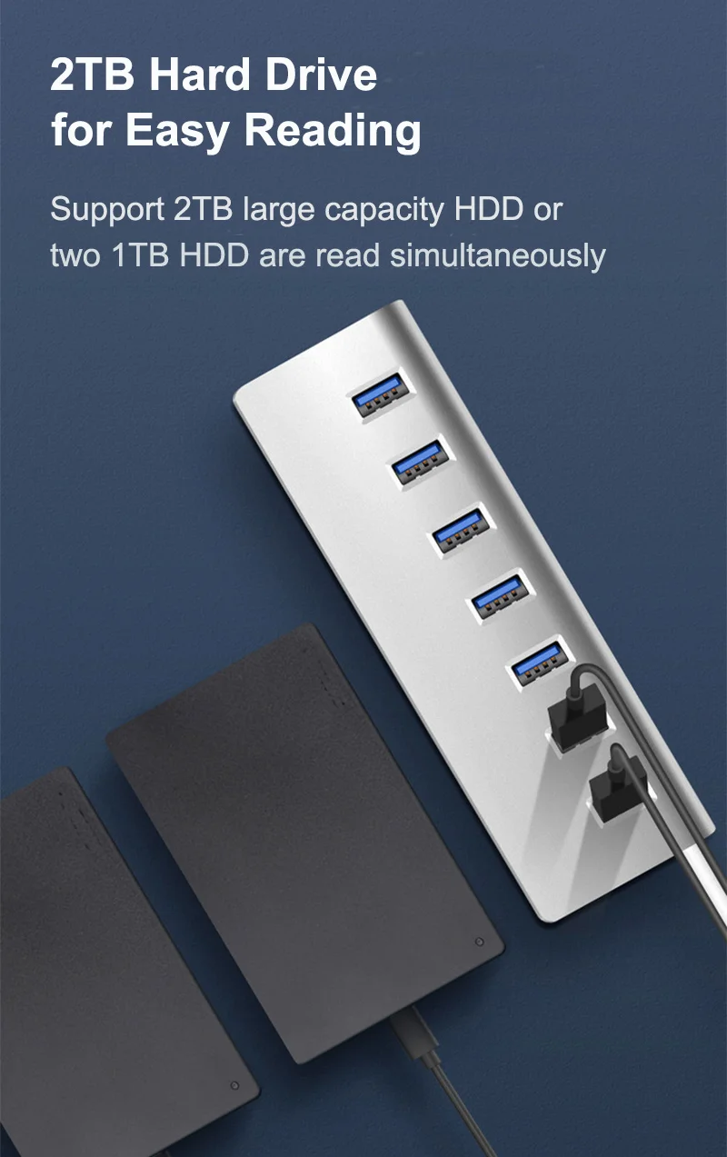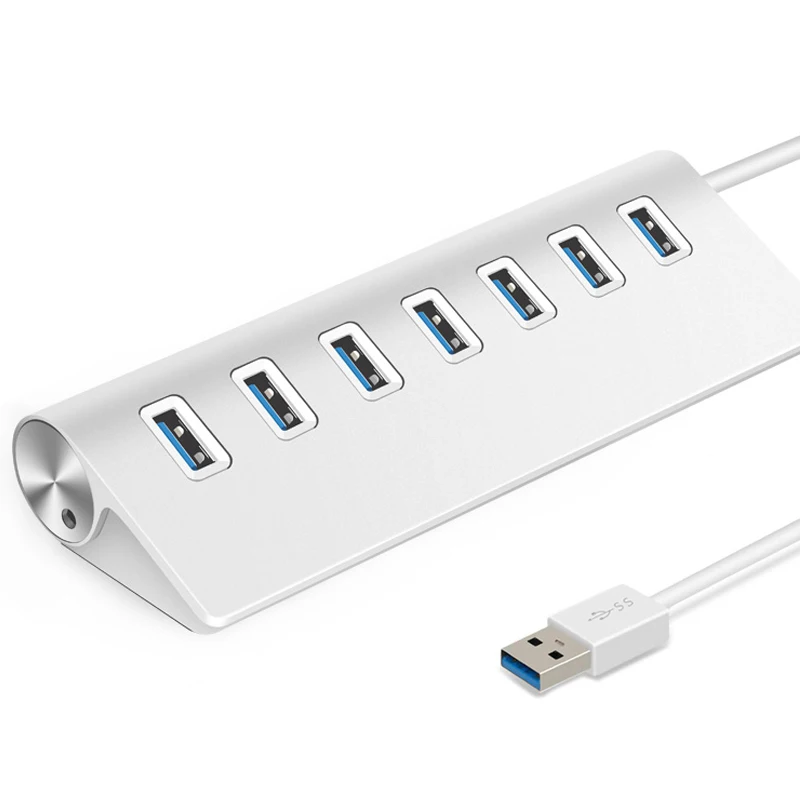 7 портов USB 3,0, силовой кабель из термопластичного эластомера, противоскользящие нижние накладки, алюминиевый корпус, пескоструйная обработка