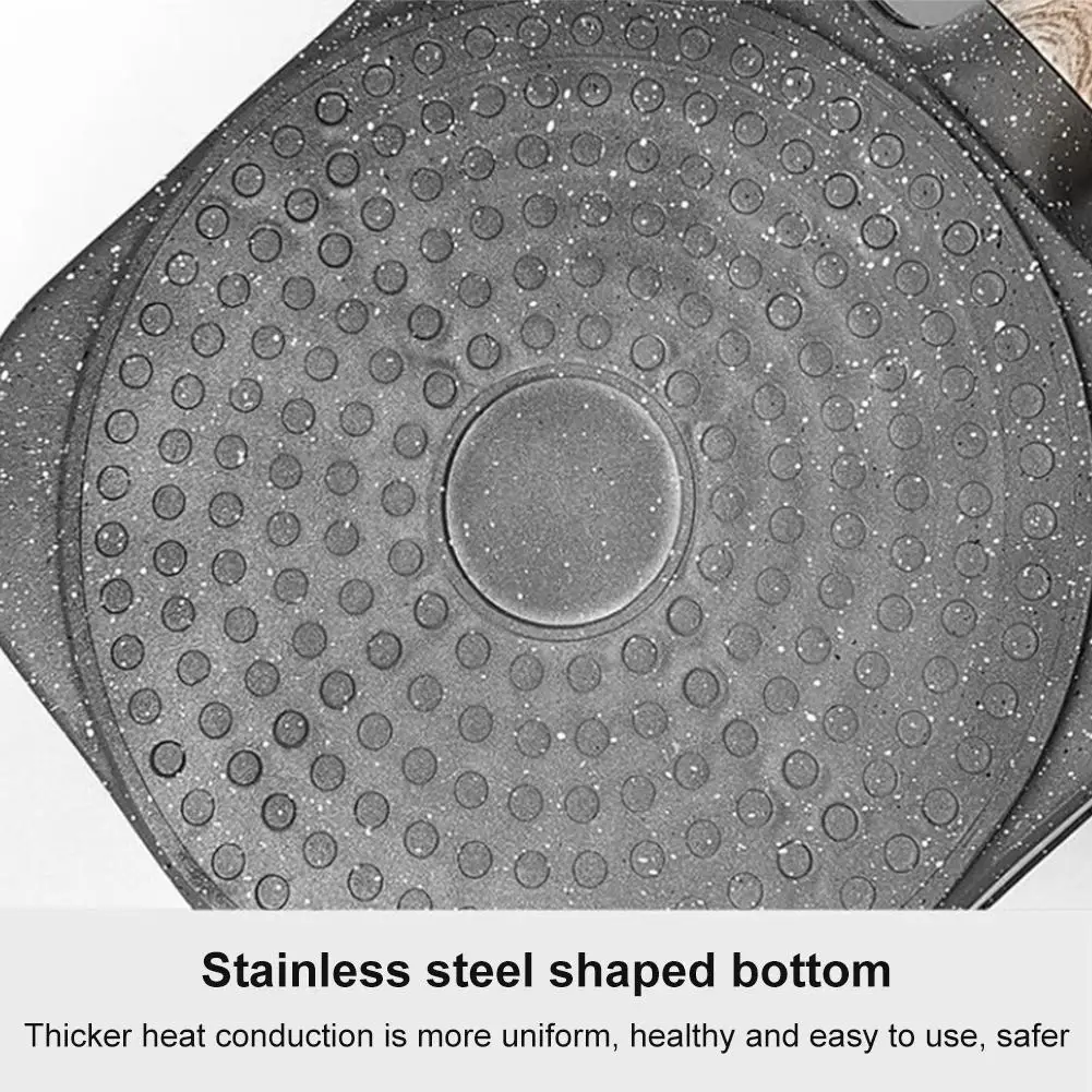 1. 4 канавки: Диаметр кастрюли 7,48 дюйма, диаметр круглого канавки 3,54 дюйма, глубина 0,87 дюйма. Одновременно работают 4 канавки, благодаря которым можно приготовить еду для нескольких человек за раз.2. Антипригарная сковорода: корпус сковороды не пригорает и не прилипает к дну сковороды. По сравнению с традиционными чугунными кастрюлями, она отлично нагревается, поэтому рекомендуется использовать при приготовлении слабое пламя.3. Универсальный Тип: благодаря утолщенному нижнему слою из нержавеющей стали, Теплопроводящая энергия более равномерна. Дно кастрюли равномерно проводит тепло и не прилипает к дну. (Черная ручка подходит только для газа, ручка под дерево подходит для газовой и индукционной плиты).4. Черная ручка из бакелита: ручка имеет обтекаемую конструкцию ручки из имитации цельного дерева, нескользящая и износостойкая, длина 6,69 дюйма, ручка очень удобная. Ручка изготовлена из бакелита, прочная и выглядит лучше. Черная ручка, простая и устойчивая к пятнам.5. Легко и быстро: готовить быстрее и проще, требуя всего несколько простых шагов. Сначала распределите масло на дно сковороды, затем положите еду на сковороду для жарки, затем переверните еду лопаткой и повторите операцию для еды.Характеристики: