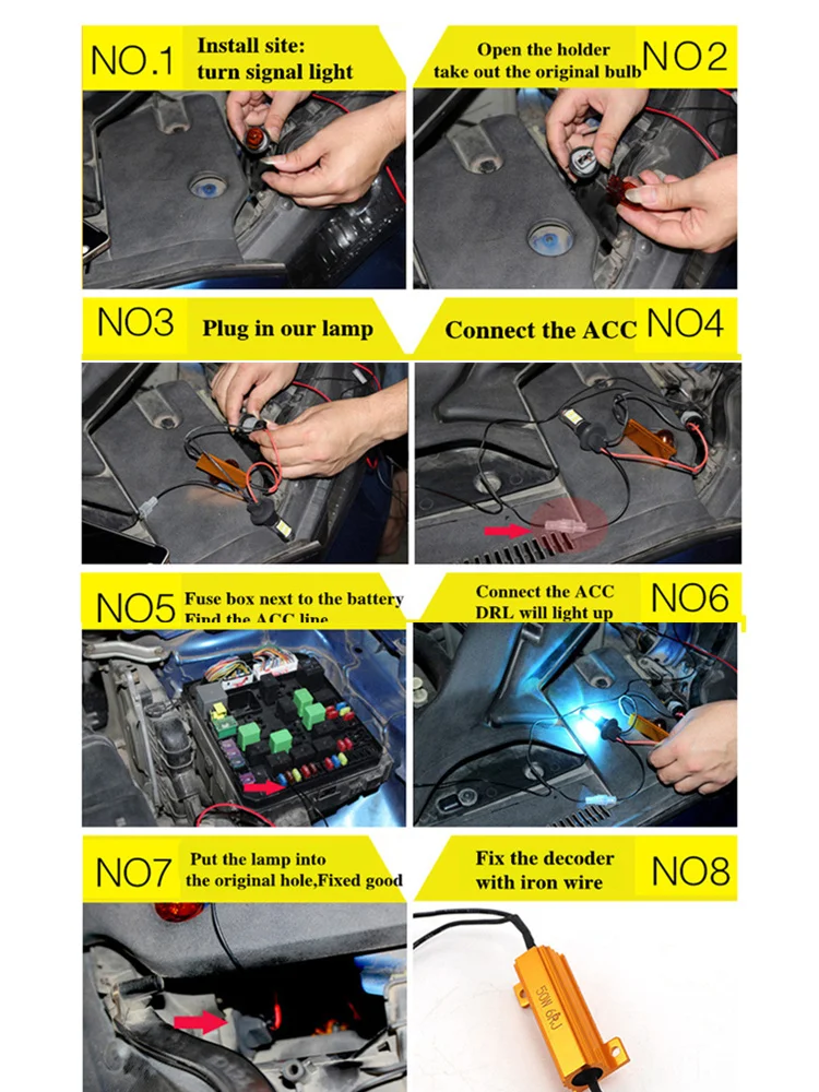 Замените лампу оригинального автомобиля на светодиодный светильник, затем линия, подключенная к источнику питания ACC, может быть реализована, яркий белый светильник во время вождения, замените на желтый светильник и мерцайте при повороте.