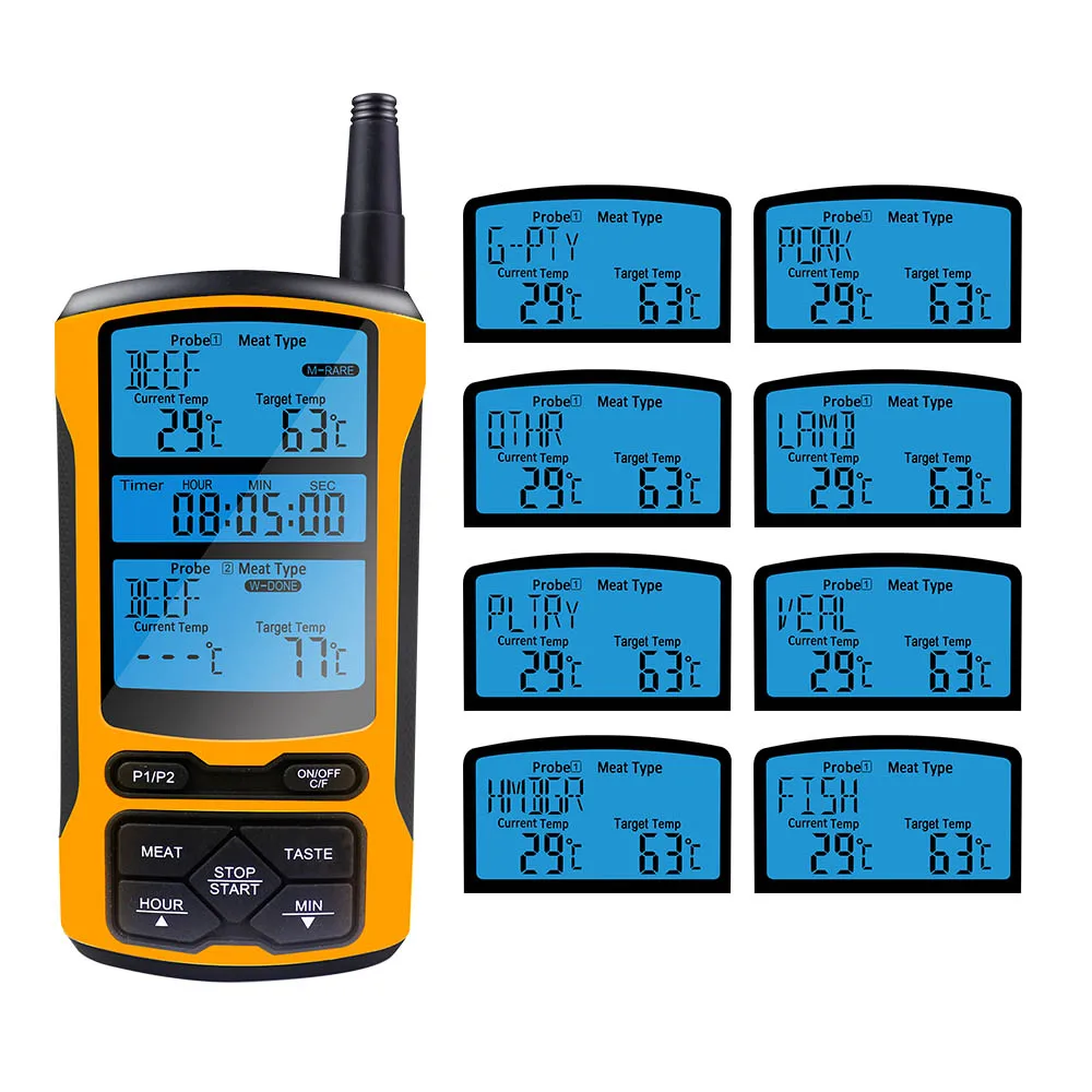 Это беспроводной термометр для пищевых продуктов сДвойной зонд, Может самостоятельно отображать температуру двух групп различных зондов и может самостоятельно выбирать тип мяса и тонкость мяса.Цвет ЖК-подсветкиМожет быть изменен в зависимости от температуры.СигнализацияВыдается, когда температура достигает заданной температуры