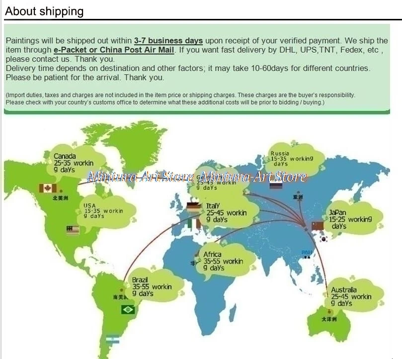 В: Что делать, если я не получил свою покупку? О: если вы не получили покупку, пожалуйста, будьте терпеливы. Ваша покупка может дойти до вас в течение следующих нескольких дней. Между тем, пожалуйста, свяжитесь с транспортной компанией на вашей стороне или свяжитесь с нами для помощи, мы постараемся сделать все возможное, чтобы помочь вам. Если ваша покупка была потеряна, мы отправим вам новую. В: Что делать, если картины, которые я купил, не нравятся? О: пожалуйста, не стесняйтесь обращаться к нам через веб-почту платформы или по электронной почте, мы решим любые проблемы с вами. Мы рады помочь вам обменять остальные, но покупатели несут ответственность за все расходы по доставке. В: почему ваши цены такие низкие? О: у нас много талантливых и мастер-художников, мы приобретаем у них тысячи высококачественных масляных картин напрямую. У нас есть Непревзойденная способность покупать картины по низкой цене и вместо увеличения нашей прибыли мы передаем сбережения нашим клиентам. Покупка у нас дает вам возможность приобрести Масляные картины по оптовой цене. В: как мне это нужно срочно, есть ли у вас ночные способы доставки? О: как правило, мы отправим картины в течение 2-7 дней после подтверждения оплаты, вы можете сообщить нам, если вам это нужно срочно, затем мы постараемся выбрать для вас способ доставки на ночь. Но мы не уверены, что товар будет доставлен вовремя полностью, потому что международная доставка трудно контролировать. В: Можете ли вы сделать индивидуальный рисунок? О: Да, если у вас есть специальный запрос, пожалуйста, свяжитесь с нами. В: Могу ли я получить скидку? О: обычно у нас будет скидка каждые несколько месяцев, вы можете поместить товары, которые вам нравятся, в корзину и Добавить в список желаний, подождите, пока система сообщит вам о скидках. В: вы предлагаете оптовую цену? О: Да, если вы хотите заказать много штук вместе, вы можете связаться с нами, и мы проверим, какую скидку мы можем предложить.