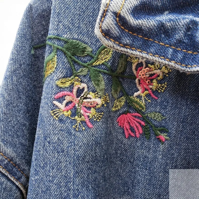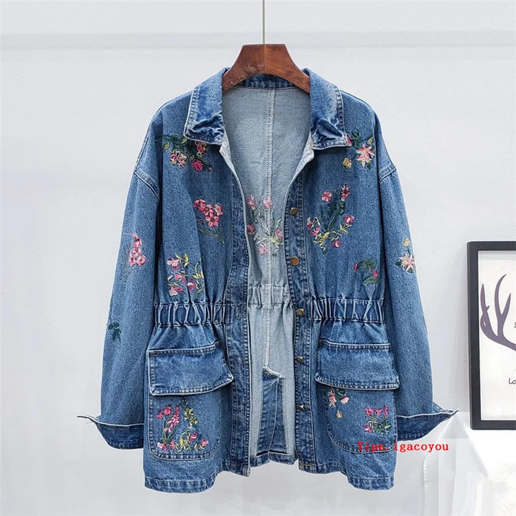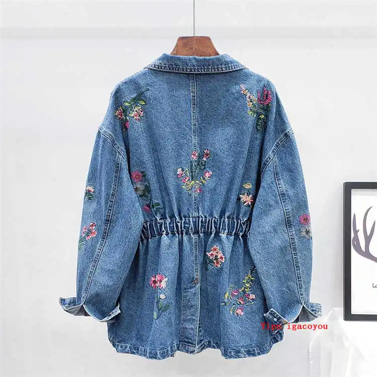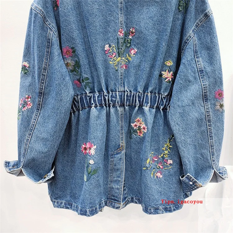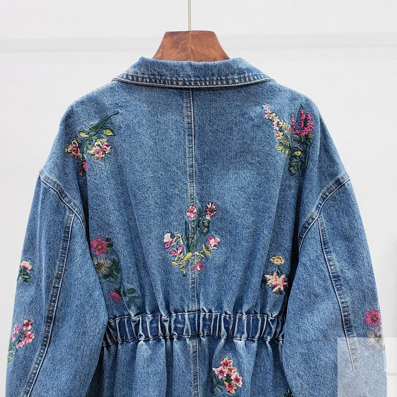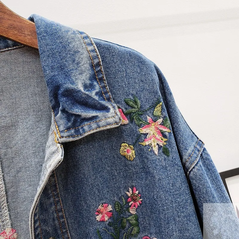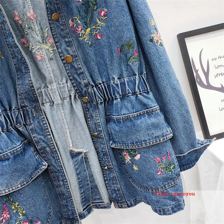 Женская джинсовая куртка, с цветочной вышивкой, осенняя верхняя одежда, джинсовая куртка средней длины с эластичной талией