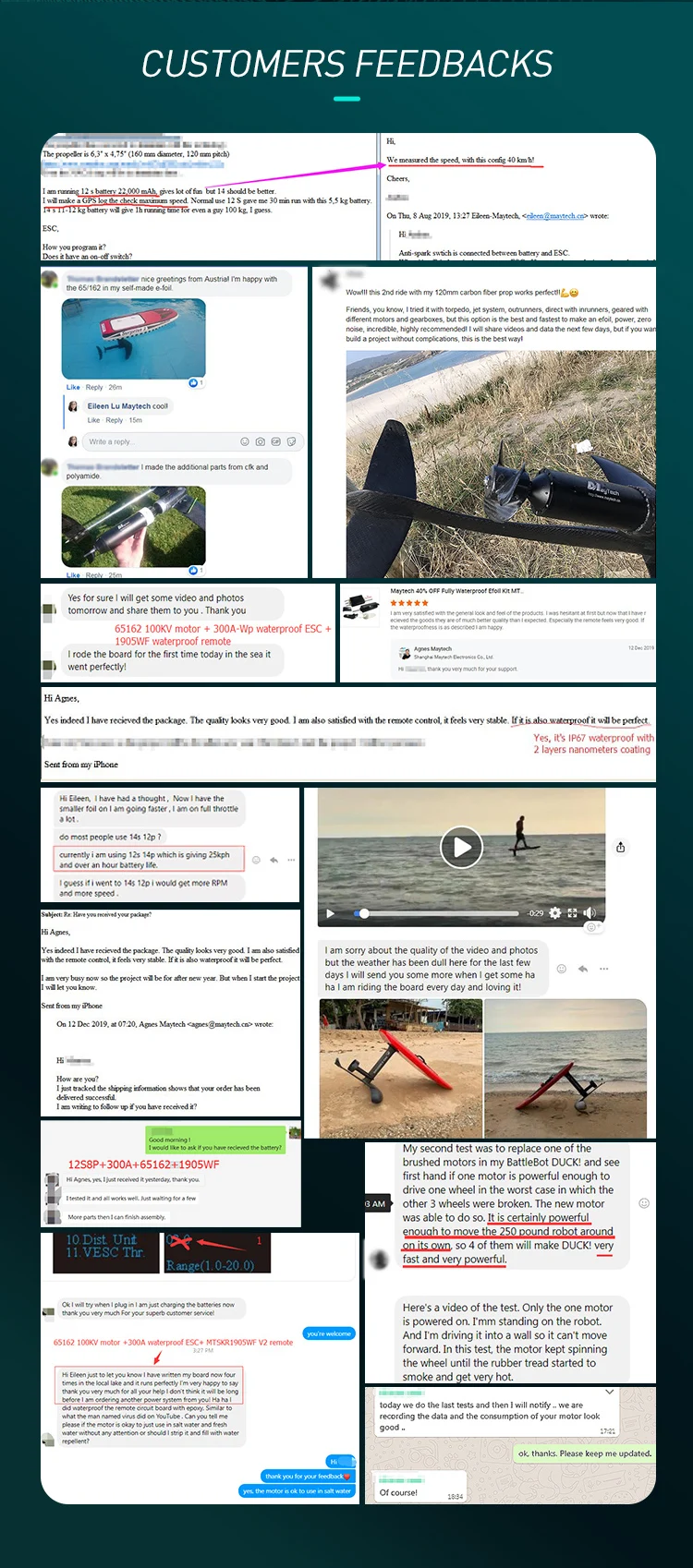 1. Чтобы расширить срок службы продукции, пожалуйста, лучше вытереть воду на продуктах и держать их для всех сухими после повседневного использования.2. Для этого комплекта ESC, потому что двигатель Бессенсорный, предлагаем использовать значение по умолчанию в ESC, мы протестировали комплект перед отправкой со значением по умолчанию, не рекомендуется изменять значения.Если у вас есть другие требования к двигателю KV, ESC или другие вопросы, пожалуйста, свяжитесь с нами agnes@maytech.cn