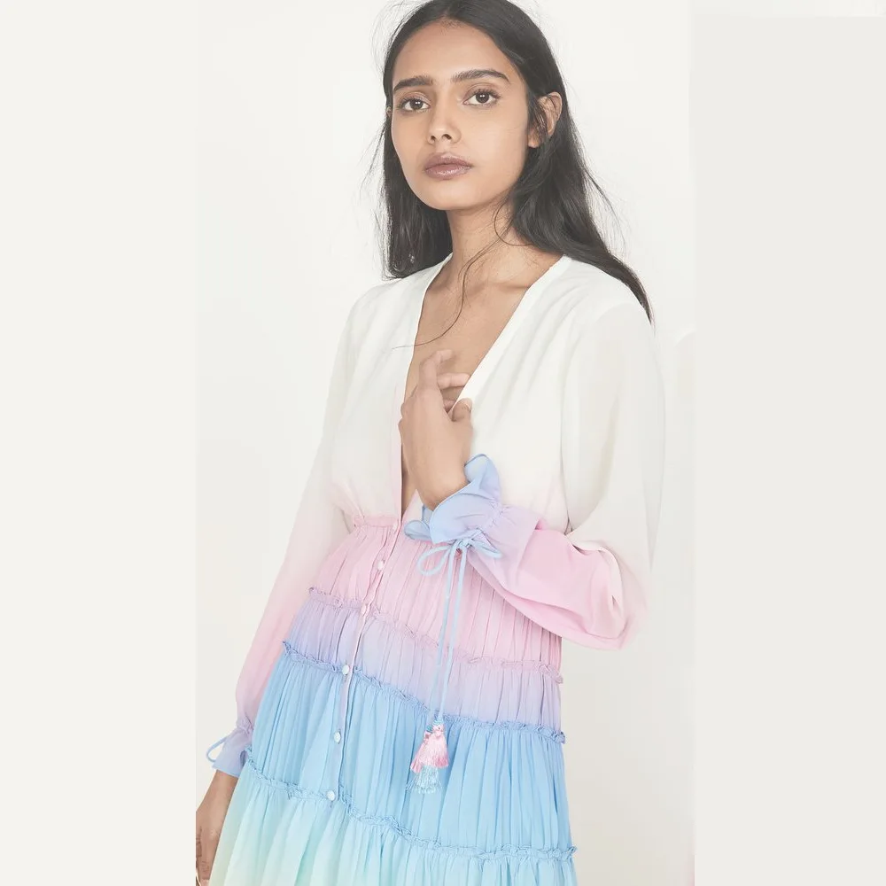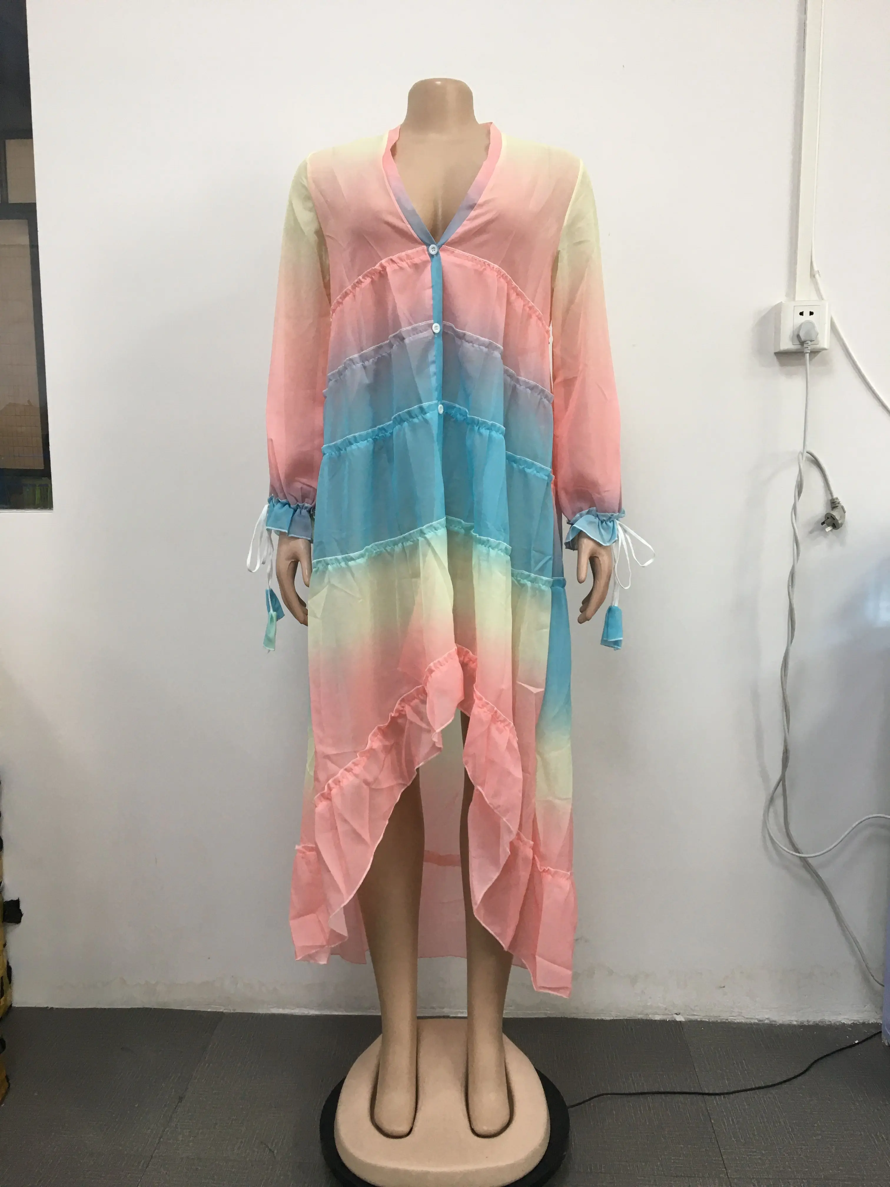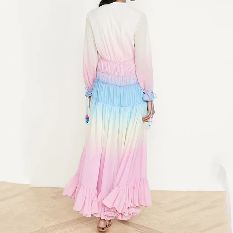 Милое свободное Повседневное платье с глубоким v-образным вырезом, градиентное платье с длинными рукавами, Радужное богемное платье для молодых девушек, элегантное пляжное платье 2020