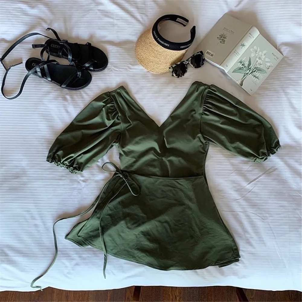 Женский Цельный купальник с юбкой, однотонная одежда для плавания, монокини с коротким рукавом и оборками, купальный костюм в Корейском стиле с пуш-ап, Зеленая Пляжная одежда
