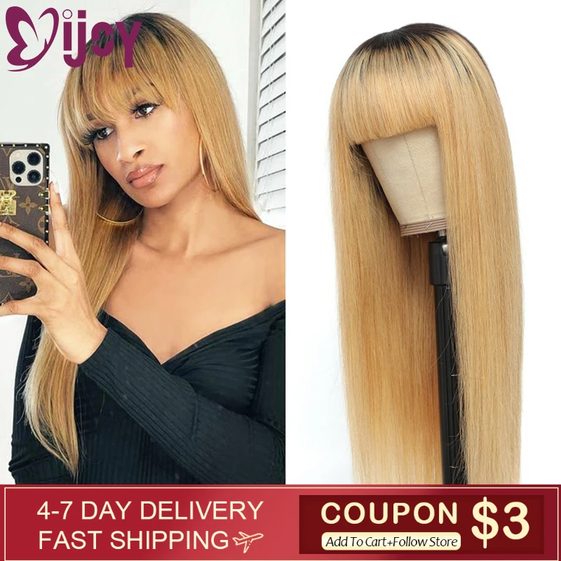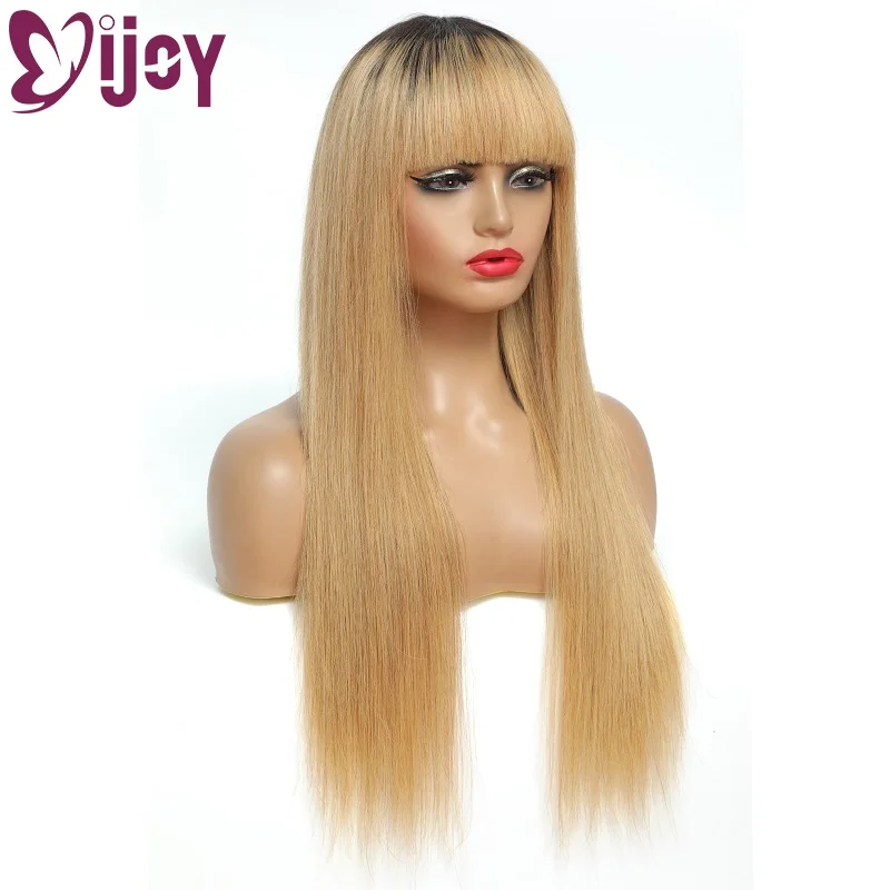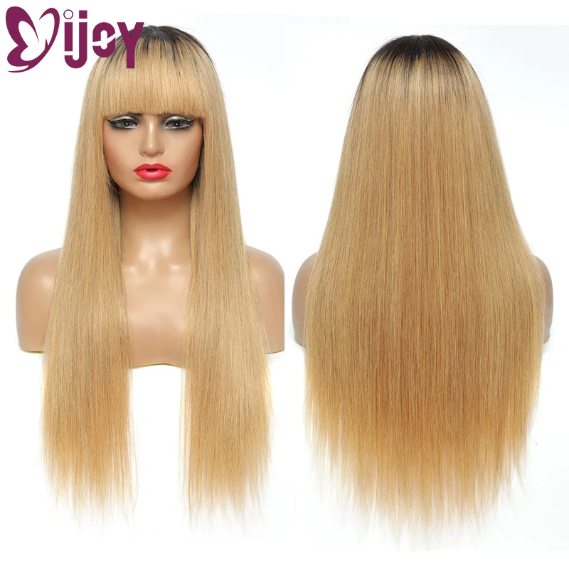 IJOY Omber Honey Blonde Бразильские прямые парики из натуральных волос с челкой для чернокожих женщин Полный машинный парик Реми Парики из натуральных волос